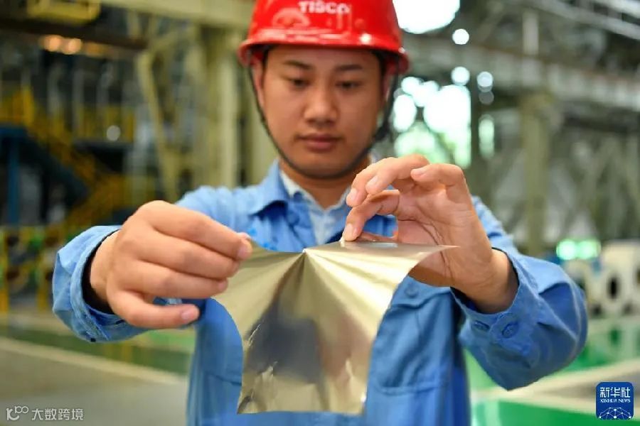 在位于山西的太钢集团,员工展示用手撕开0.02毫米厚的超薄带状不锈钢(2019年5月24日摄)。新华社记者 曹阳 摄