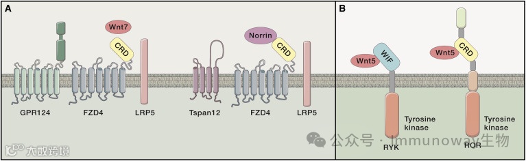 除了核心受体FZD和LRP5/6外,还有其他几个与Wnt信号传导有关的跨膜分子。其中包括ROR和RYK酪氨酸激酶受体,它们能够分别使用CRD或WIF结构域与Wnt配体结合。激活后与DVL相互作用,导致Wnt途径成分的磷酸化。此外,GPR124是建立血脑屏障中正确的Wnt信号传导所必需的。由NDP基因编码的Norrin也可以结合和激活Wnt受体。Norrin以高亲和力和特异性与FZD-4结合,Norrin、FZD-4和LRP5的共表达有效激活Wnt/β-catenin信号传导。