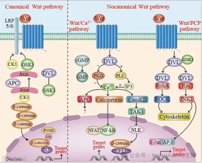不依赖β-catenin-TCF/LEF的Wnt信号通路被归类为“非经典信号通路”,可以调控细胞内的转录和非转录反应,调节细胞极性和迁移。PCP和Wnt/Ca2+通路是两种最典型的依赖β-catenin的Wnt通路。