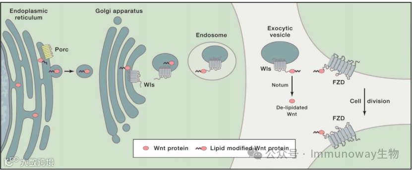 在内质网中,Wnts被Porcupine(Porc)修饰与脂质(棕榈油酸的酰基)结合。脂质主要作为Wnt受体FZD的结合基序发挥作用,但它也使Wnt蛋白疏水,并可能将其束缚在细胞膜上。脂质可能有助于限制Wnt的传播及其作用范围。