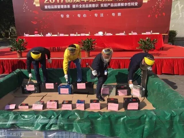 雄韬是对客户尽心尽责的企业,但是任何一家企业都难免会有存在不良品。为了树立全员品质意识,深化品质改革,提升公司品质战役的士气。当日品质活动年启动大会最后的重头戏就是以铁锤砸碎不良品。集团总裁张华农、总部平台执行副总裁陈宏、供应链执行副总裁吴德平、以及生产副总裁洪常兵纷纷高举质量大锤,对现场摆放象征各式不良品的电池无情砸去,砸掉了身上的瑕疵与尘土,也砸开了一条品质的康庄大道!
