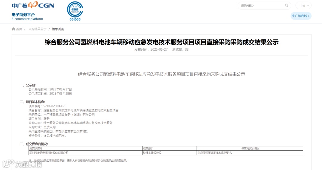 近日,雄韬股份成功中标中广核白鹭综合服务(深圳)有限公司氢燃料电池车辆移动应急发电技术服务项目。本次中标标志着雄韬股份在氢能领域的综合实力再获权威认可,同时也将进一步巩固公司在氢能领域的优势地位。