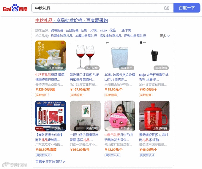 因为马上就要过中秋节了,先搜了几个中秋节的时令词:中秋礼品、大闸蟹、月饼。搜索结果中广告有4~5条,然后会有百度百科、百家号、百度文库、百度贴吧等百度自家的各类链接若干条(一般每页至少3条),最夸张的是,除了上面这些,还会出现一个百度爱采购的链接,并且这个链接不是文字的,而是两行8图(每行4图)的整屏展示——