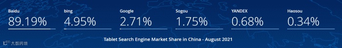 平板端,百度搜索仍是独占鳌头的老大,占比89.19%,第2名必应仅占4.95%。谷歌第三,占比2.71%。搜狗第四,占比1.75%。