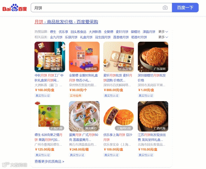 “月饼”百度搜索结果中的“爱采购”展示区