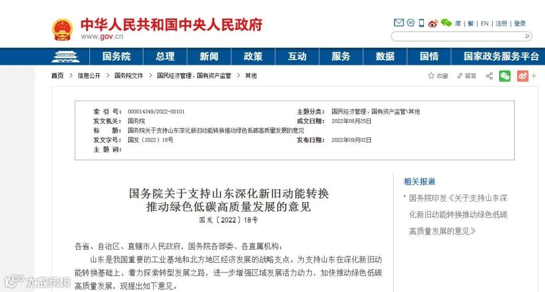 9月2日,国务院印发《关于支持山东深化新旧动能转换推动绿色低碳高质量发展的意见》。