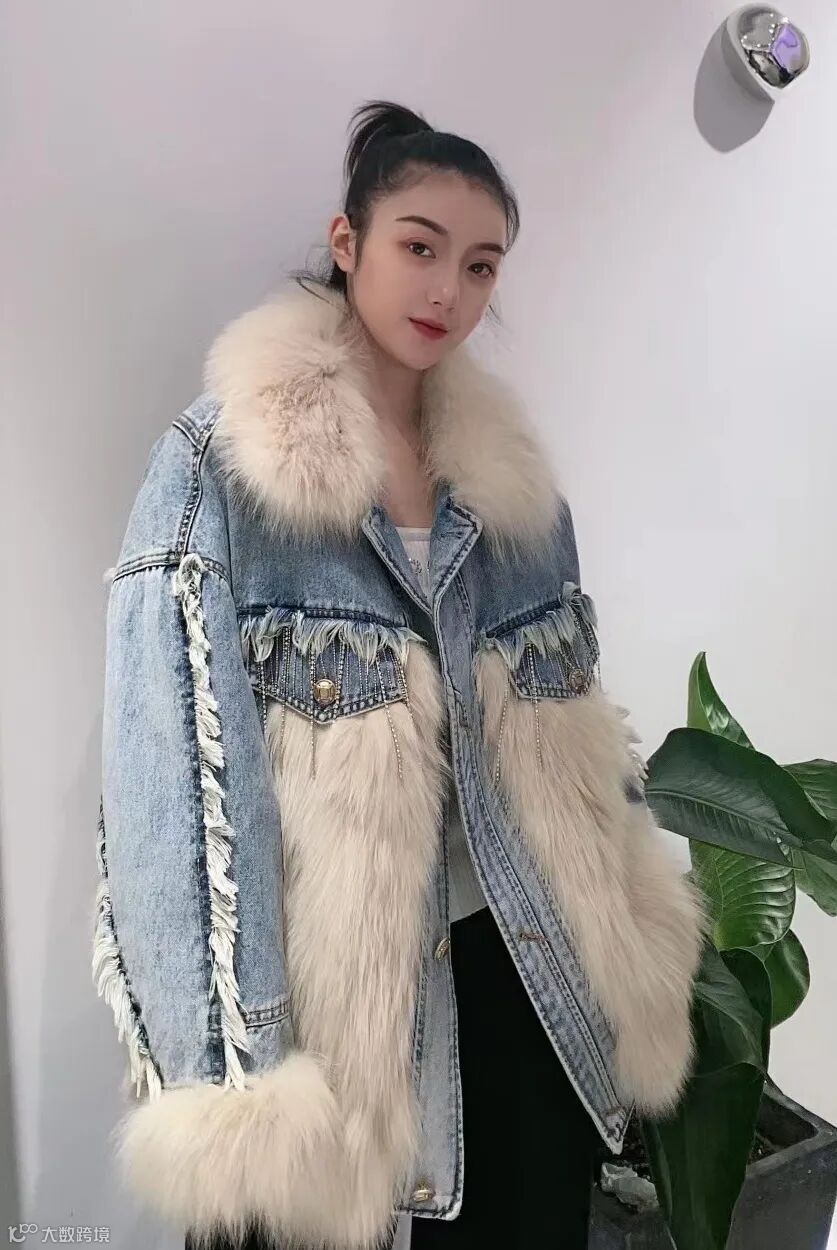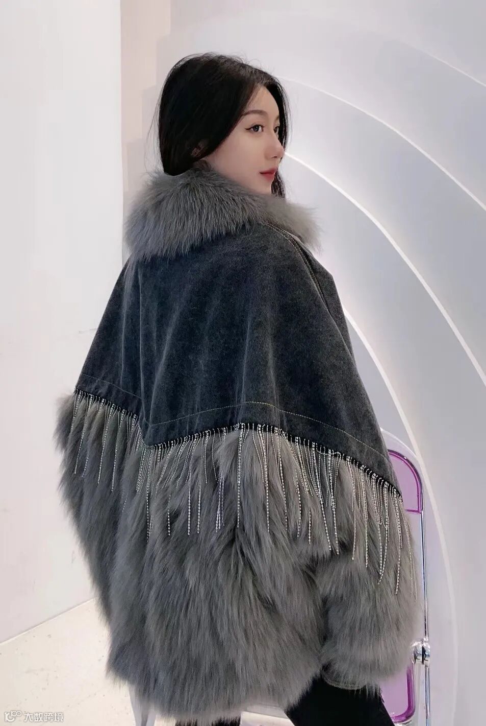 狐狸毛拼接牛仔面料 加上流苏小心机设计