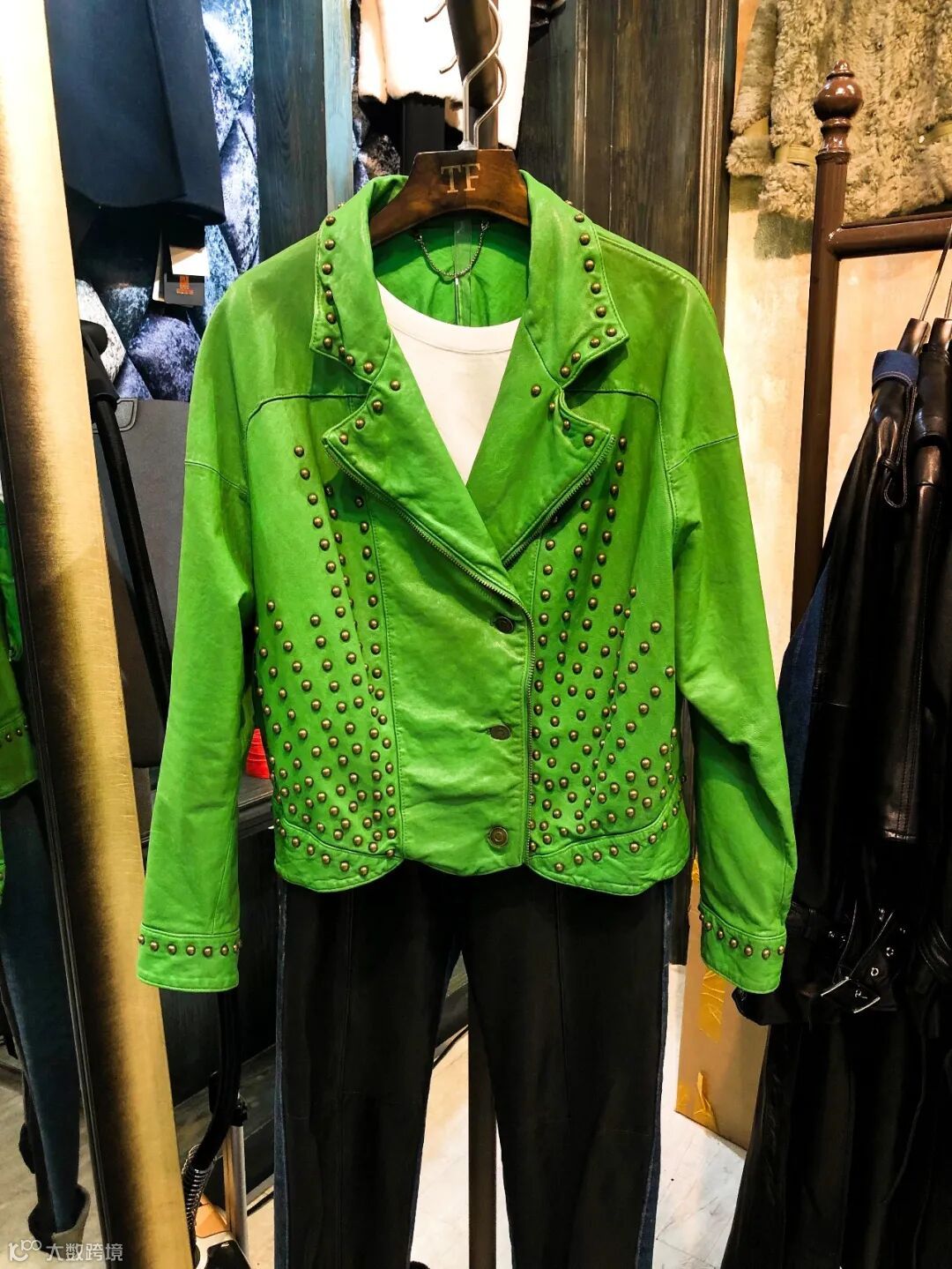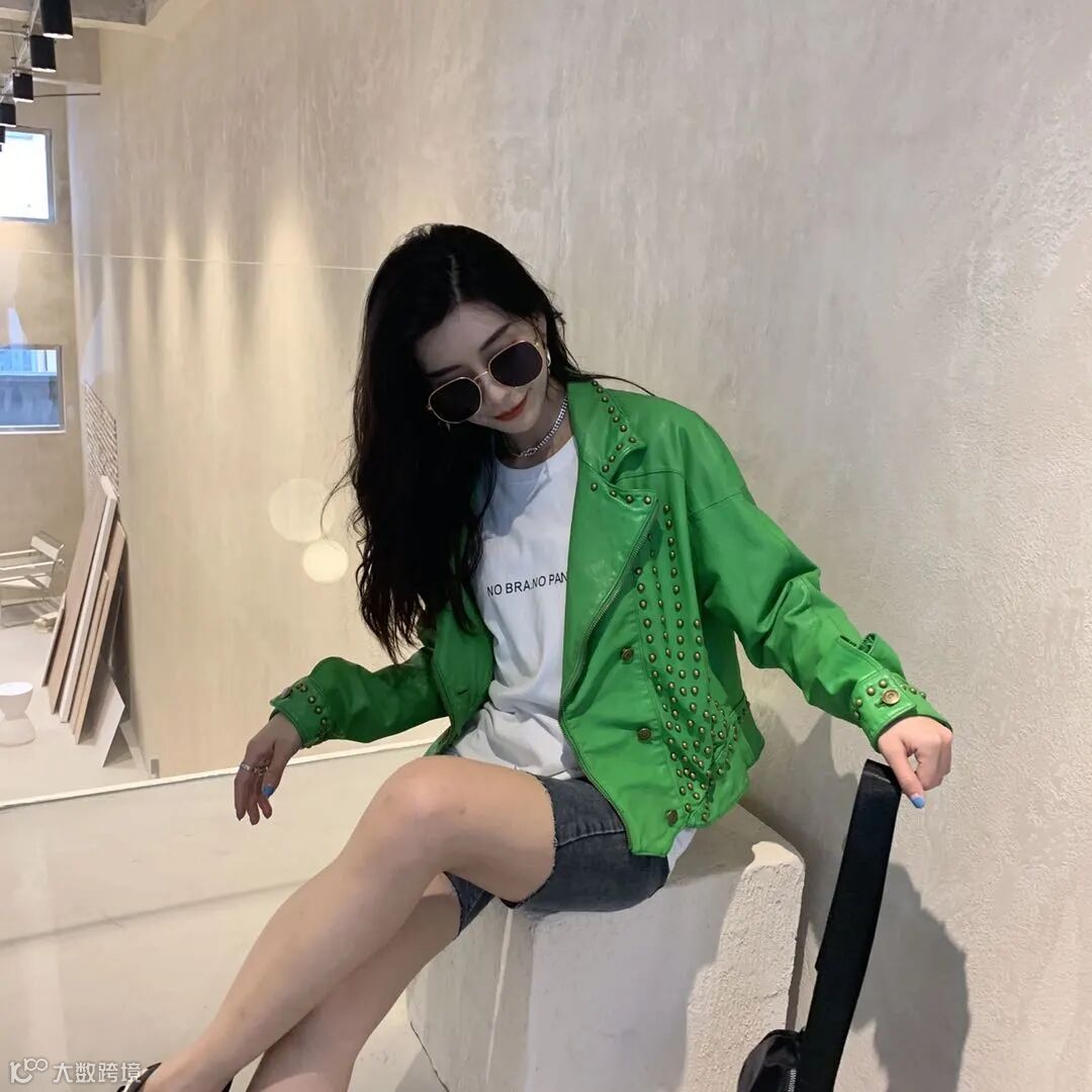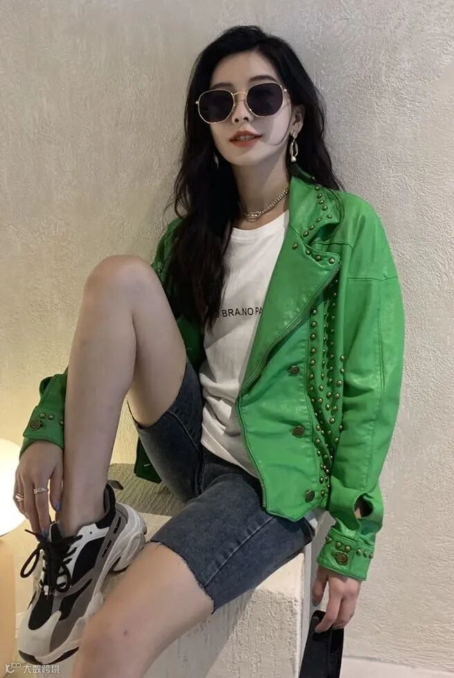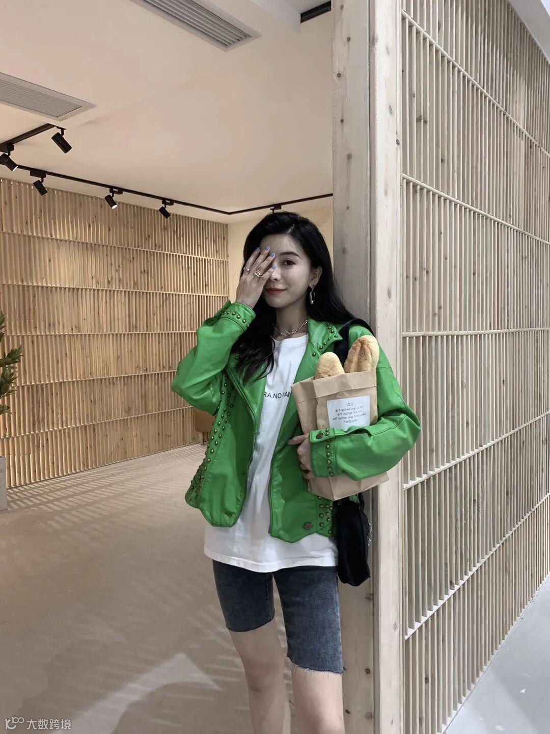春日甜酷女孩约会bi备的绿色短款皮衣,搭配简约白T、紧身牛仔库,春日清新感UP,最适合温柔多情的春天。