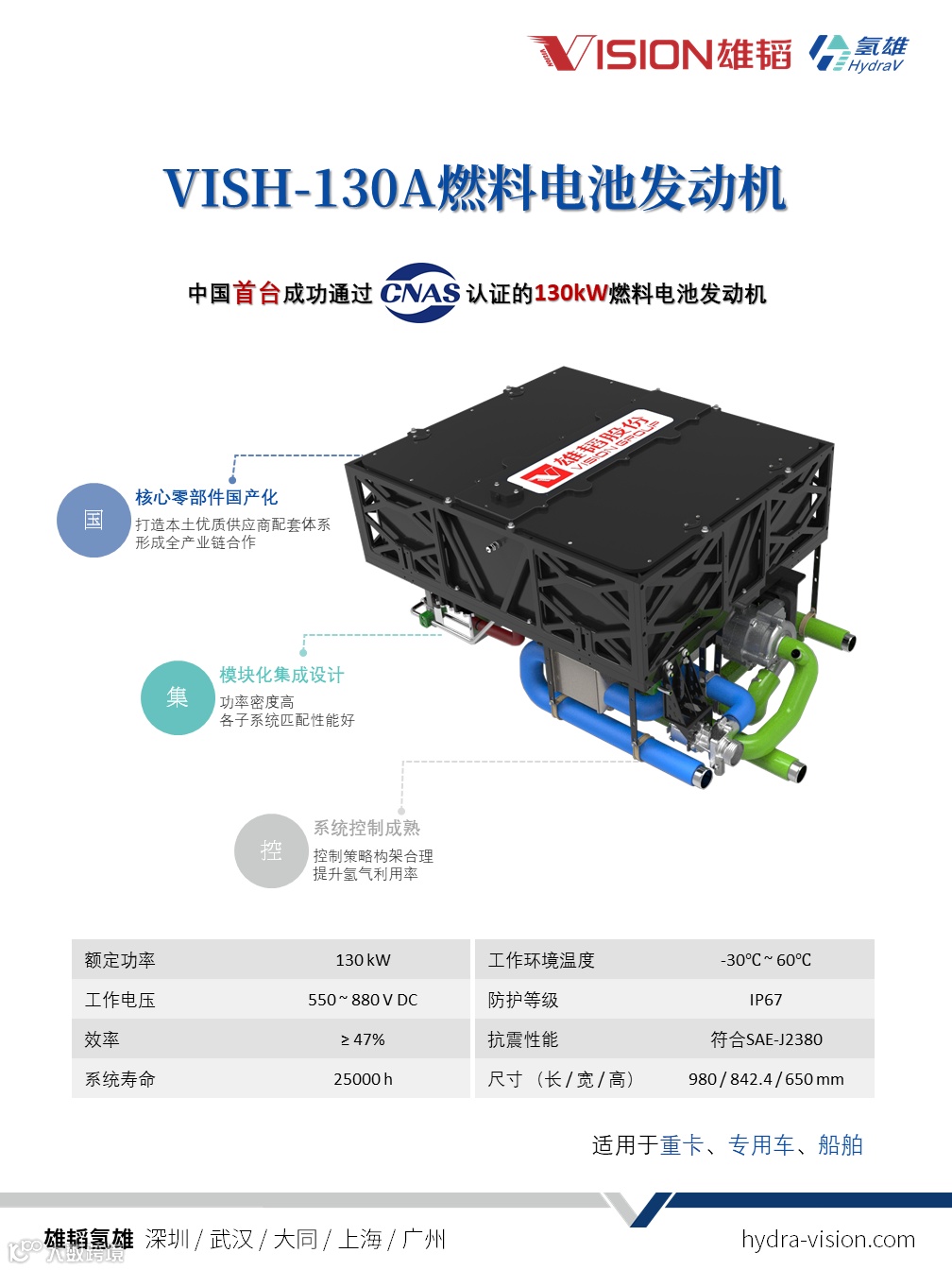 本次通过认证的VISH-130A,是雄韬氢雄与阳泉煤业(集团)有限责任公司针对重卡市场联合开发的大功率燃料电池发动机系统,在大同完成了前期研发与测试工作。该系统各部件采用模块化集成设计,并辅以成熟稳定的控制策略,整机具有可靠性高、环境适应性强、寿命长、便于维护保养等优点。