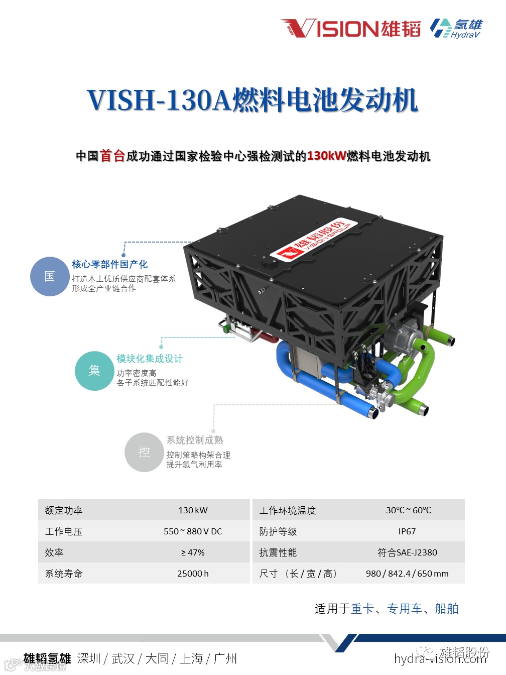 7月21日,雄韬氢雄燃料电池发动机VISH-130A通过国家检验中心强检测试,电堆功率145kW,发动机系统净输出130kW。这是现阶段我国通过权威机构认证的最大功率氢燃料电池发动机。