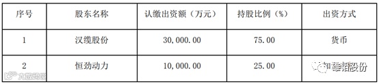 合资公司的注册资本为人民币4亿元,其中汉缆股份以现金出资3亿元,占合资公司75%股权,恒劲动力以专利和氢能备用电源设备制造的专门技术和技术秘密作价出资1亿元,占合资公司25%股权。
