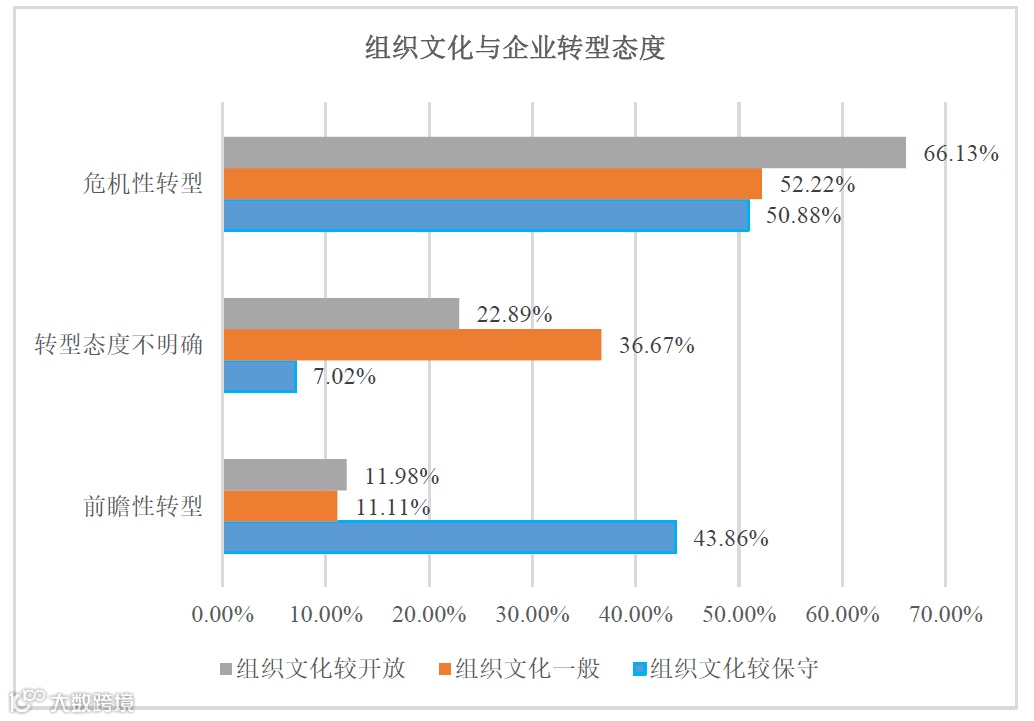 在一个较为开放的组织文化环境中,组织成员往往对变革抱有欢迎的态度,至少不会对变化强加抵制;此外,开放文化下的企业管理人员对战略转型的包容程度更高,这会使得企业进行战略转型的过程更为顺利。我们发现,74.70%受访企业的企业文化较为开放,9.81%受访企业的企业文化较为保守。