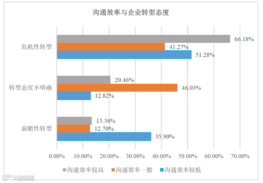 国外学者海蒂等人在对企业战略转型的调查中发现,被调查企业战略转型中的首要障碍就是内部沟通的障碍。具体来说,沟通方式与沟通效率在一定程度上决定了企业上下达成“战略共识”的程度,并最终影响企业转型的实施效果。受访企业中,82.44%的企业的沟通效率较高,10.84%的企业的沟通效率一般,6.71%的企业的沟通效率较低。