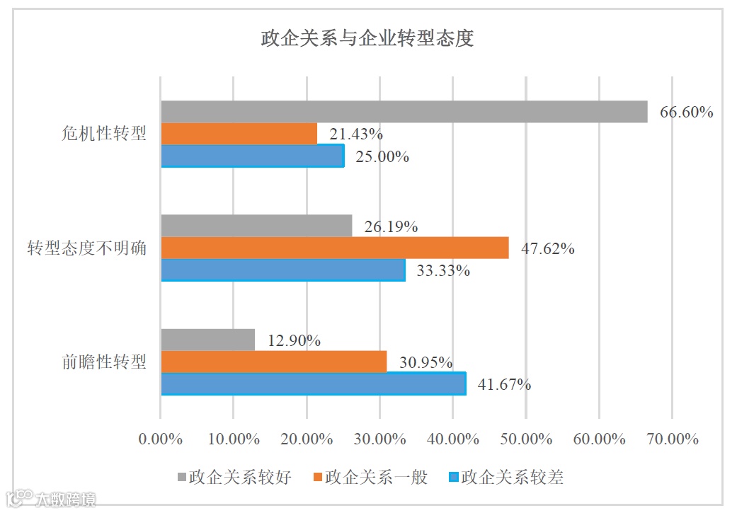 接下来,调查发现,政企关系较好的企业在经历此次疫情之后进行转型的比例(54.84%)低于政企关系较差的企业(58.33%),这主要是因为,政企关系较好的企业容易陷入一种“温水煮青蛙”的处境,即在舒适、优越的环境中渐渐丧失了危机感和警惕性,面对环境变化时较少选择实施战略转型。此外,政企关系与企业转型态度也有着密切联系。政企关系较好的企业与政企关系较差的企业相比,更倾向于选择危机性转型。这一现象背后的原因可能是,良好的政企关系给予了企业强烈的“安全感”,使得企业在面对环境变化时,不太会为眼前的不确定性而感到担忧,因此它们更倾向于在时点更晚、事态更严重时才进行战略转型。
