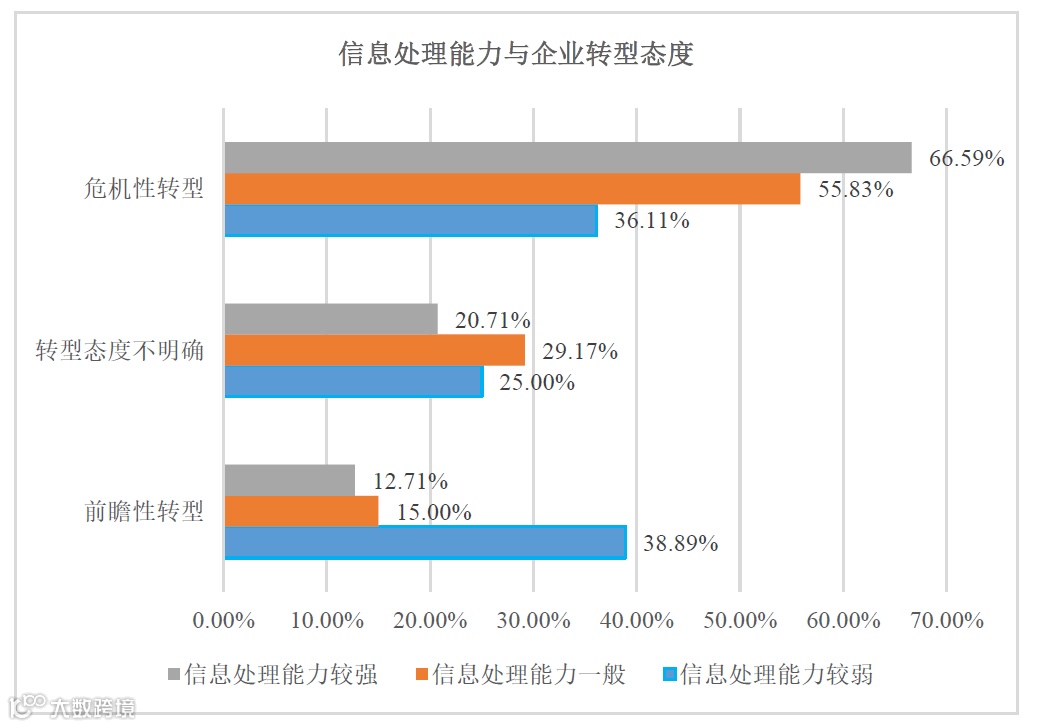 企业的信息处理能力会影响其进行战略转型的态度。如表4所示,信息处理能力较强的企业在此次疫情之后进行危机性转型的比例(66.59%)远高于信息处理能力较弱的企业(36.11%);而前者进行前瞻性转型的比例(12.71%)低于后者(38.89%)。这主要是因为,较强的信息处理能力能够使企业战略决策的“齿轮”运转得更快,因此这些能力较强的企业进行的转型大部分都属于应对环境突变的危机性转型;而信息处理能力较弱的企业需要在环境变化对其造成不利影响前就提早“消化”好转型所需的各种信息。