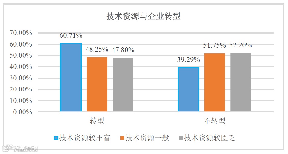 技术资源较匮乏与一般的企业数量接近企业总数的50%,企业在战略转型中的技术创新能力都有待提高,因为技术已经成为它们转型道路上的“绊脚石”。