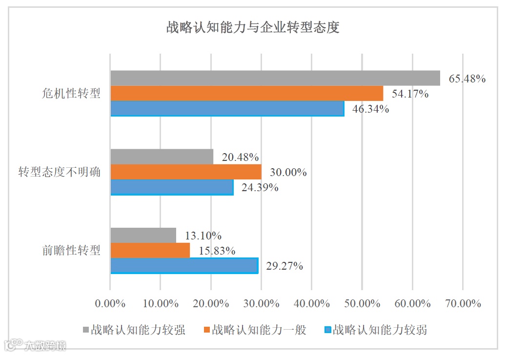 企业的战略认知能力与其转型态度也有着密切关联。调查发现(表2),战略认知能力较强的企业在疫情后实施危机性转型的占比(65.48%)高于战略认知能力较弱的企业(46.34%)。这主要是因为,较强的战略认知能力能够使企业对环境的实时变化有更好的把握,从而使企业在应对环境突变时表现得更为沉稳;而战略认知能力较弱的企业由于对环境激变的应对能力更低,往往需要“笨鸟先飞”,在环境已对其造成不利影响前便进行前瞻性的战略转型。