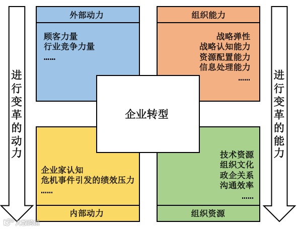 在内外部环境的剧烈变化之下,企业会产生进行战略转型的动机,但还需要具备一定的转型能力,才能够克服种种约束,将战略转型顺利实施下去。进一步来说,企业进行战略转型所需要的组织能力,必须能够使企业从当前的战略和历史行为中“解放”出来,摆脱原来的那一套体系,将新方法、新思想坚定地推行下去。组织能力主要包括战略弹性、战略认知能力、资源配置能力、信息处理能力等。