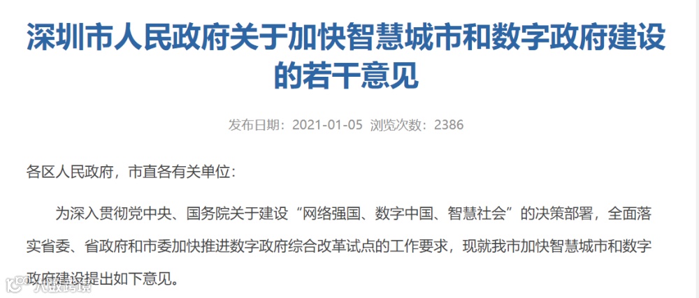2021年1月5日,深圳市人民政府发布《深圳市人民政府关于加快智慧城市和数字政府建设的若干意见》(简称《意见》),提出聚焦“优政、兴业、惠民”,打造数字政府、数字经济和数字市民三位一体的数字深圳。