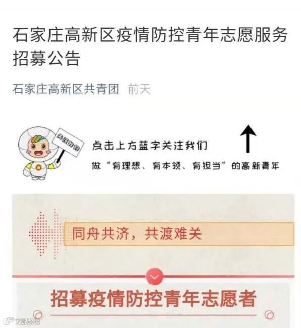 在微信公众号上发布疫情防控青年志愿者招募公告,组织号召全区团员青年们以实际行动为石家庄加油,助力疫情防控,消息发出后,得到广大青年的踊跃报名,迅速建立了一个