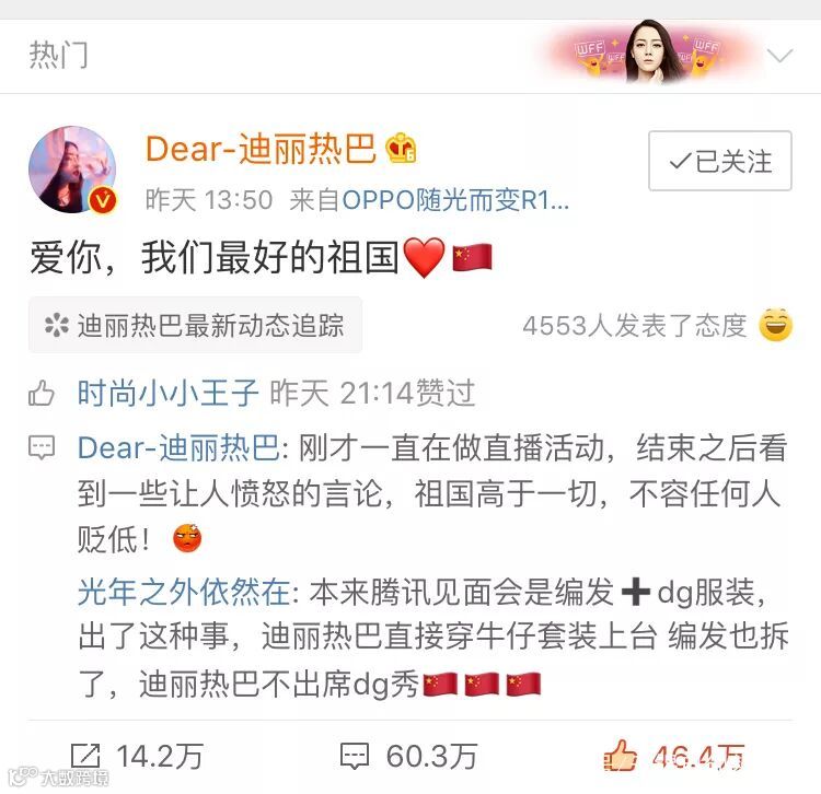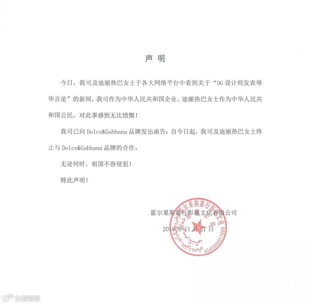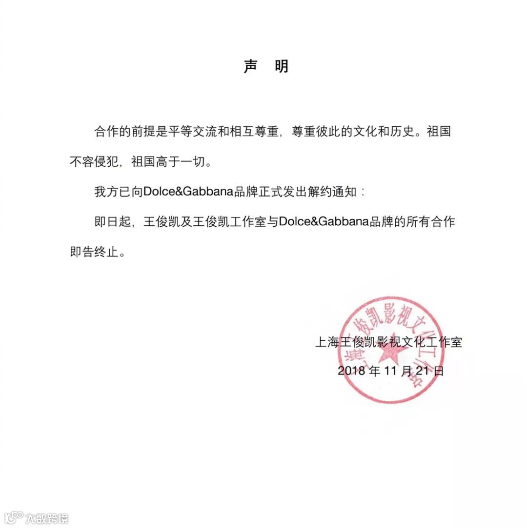 事情一出众人纷纷表示愤慨,原定出席大秀的陈坤、李冰冰、唐艺昕、王俊凯等人均在微博发声,宣布退出原定于21日晚在上海举办的D&G大秀。D&G亚太地区品牌大使迪丽热巴、王俊凯工作室分别发表声明,宣布中止与该品牌合作。