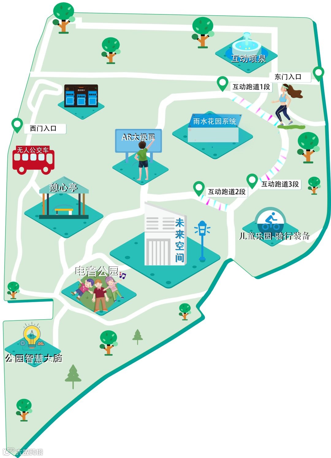 互动自行车位于儿童乐园区,将游人骑车产生的能量转化为电能,为水景和照明供电,根据骑行的速度不同,水景的高度和灯光的亮度也随之变化。