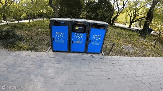 在公园主出入口和憩心亭等重要景点分布着一些特殊的垃圾桶。这些垃圾桶拥有感应开启、垃圾自动压缩、垃圾满溢报警等功能。后续还会进行AI智能提升,增加协助垃圾分类的语音问答功能。