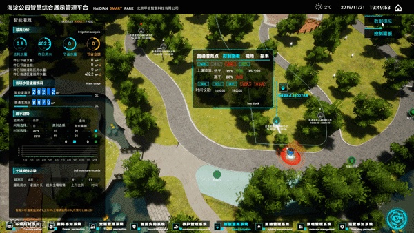 公园智慧管理平台实现对园内安防、交通、照明、灌溉、病虫害、保洁、设备管理、能耗、环境等系统的实时监测及远程智能化控制。提升公园日常管理的科技化、精细化、节约化水平。
