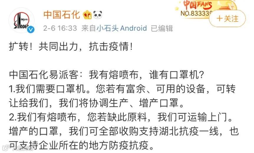 我有熔喷布,谁有口罩机?2月6日,中国石化官方发布一则微博表示自己手中有生产口罩所需的原材料熔喷布,意图寻找口罩机来协调生产、增产口罩。