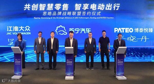 6月10日,大众汽车集团旗下新能源汽车合资企业江淮大众与苏宁汽车、博泰悦臻共同宣布启动思皓品牌战略联盟。三方的联盟将基于新型场景化的销售模式,打造电动汽车智慧零售,并在多个领域展开业务合作。同日,思皓汽车旗舰店于苏宁易购平台正式运营。此外,江淮大众与苏宁汽车合作的苏宁广场思皓e栈于杭州落成。