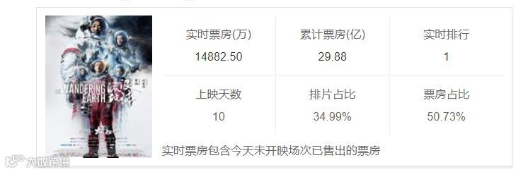 《流浪地球》上映十天,实时票房累计已超29亿,排片占比34.99%,一路反超《疯狂的外星人》和《飞驰人生》,甚至超过了复联3的票房,成为春节档最大黑马。