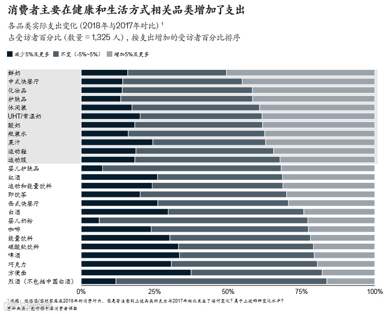 大城市中,60%的消费者表示会经常查看包装食品的成分表,会购买看起来更健康的产品。在我们追踪的25个商品品类中,鲜奶是2018年中国消费者同比支出增长最多的一项。半数受访者表示,他们会购买更多鲜奶,还有38%的受访者表示会购买更多酸奶。“年轻购物达人”则对天然原料制作的酸奶情有独钟。55%的受访者表示“健康和天然原料”是他们购买产品时的首选因素,此外“无糖”、“有机”等概念也比较重要。