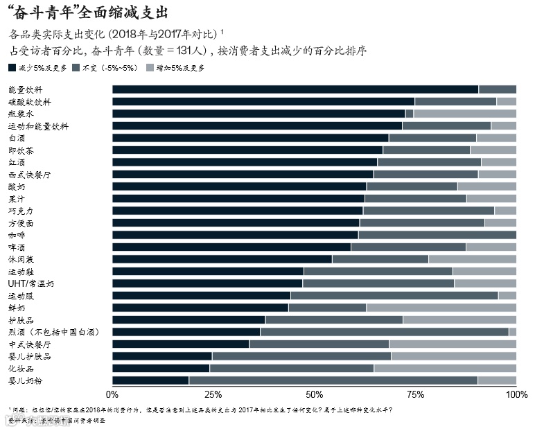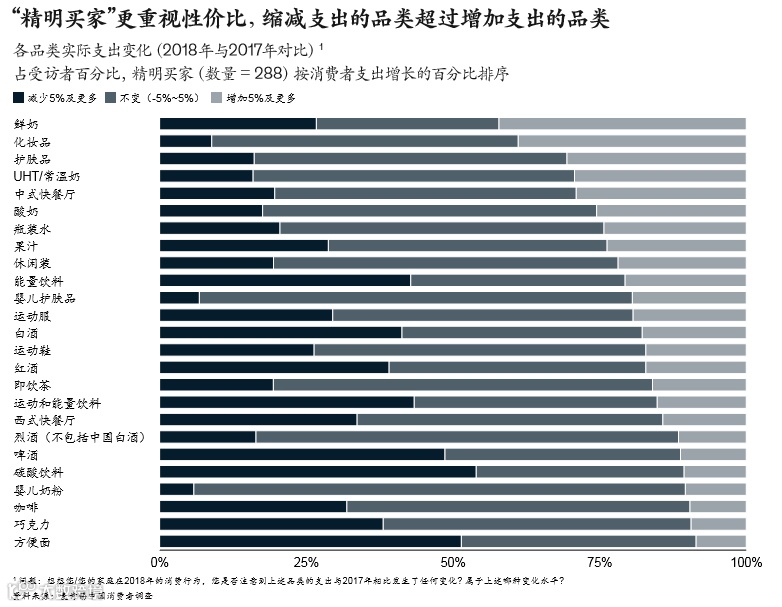绝大多数受访者在支出方面都表现得更加谨慎。60%的受访者表示,即使自己感觉比较富有,但仍希望把钱花在“刀刃上”。在生活成本高昂的大城市,不同消费群体则表现各异,应对经济紧缩的方式不尽相同,在较为谨慎的三类消费者群体中,以忙碌而富有的中年人为代表的“品味中产”群体,更加看重品质,他们愿意为高品质商品付出昂贵的价钱,而不是单单为社会认同而买单;而以一线城市中年女性为代表的 “精明买家”更注重最高性价比,2018年他们减少支出的品类已经超过增加支出的品类;新观察到的节俭型消费群体“奋斗青年”则全面缩减了非必需消费品方面的开支。