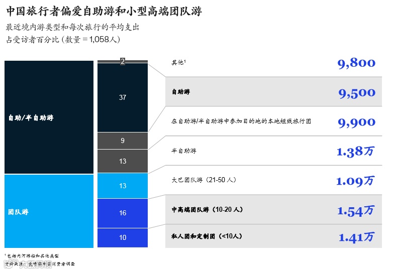 常言道“读万卷书不如行万里路”。为了开阔视野、增加生活乐趣,中国消费者旅行热情非常高。2014年至2018年,中国城市消费者旅行支出的年复合增长率为14%,超过GDP增长率7%。随着中国消费者旅行次数增加、旅行经验丰富,他们在行程规划时也更加成熟和有辨别力。在国内游方面,超过60%的受访者表示,他们现在更偏爱自助游,而非10年前流行的大型团队游。这在一线城市尤其明显(80%的受访者更青睐自助游)。如果选择团队游,越来越多的中国旅行者会选择小型、高端旅行团。45岁及以上年龄的消费者更喜欢小型团队游(32%的受访者偏爱这种方式)。