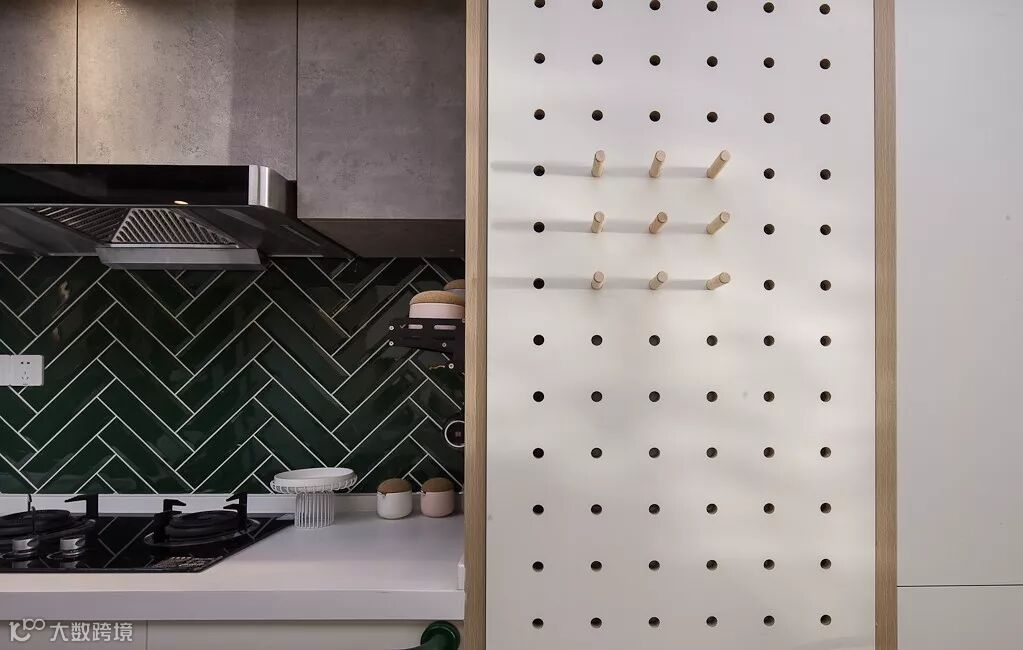 储藏柜上的规整圆孔,可以由老人自己调整规格,挂上不同的物品。