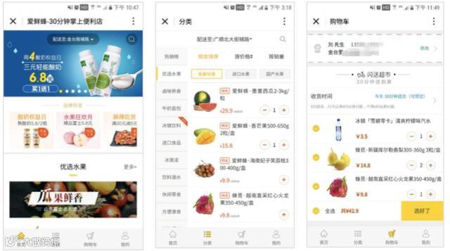爱鲜蜂的初版小程序,和APP长得差不多。最终,爱鲜蜂把APP上的排行榜之类(使用频次较低)的模块全部去掉,只保留用户最需要、点击频次最高的模块,形成最直接的购物通路——首页、分类物品、选购、购物车结算、配送。一通减法做下来,形成了现在的“爱鲜蜂闪送超市”。