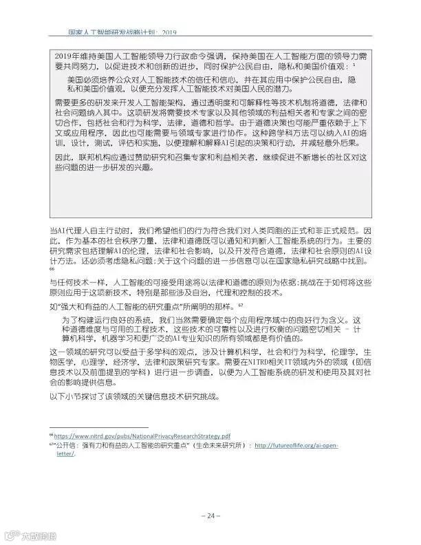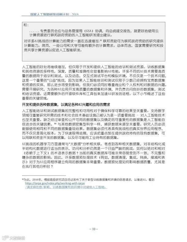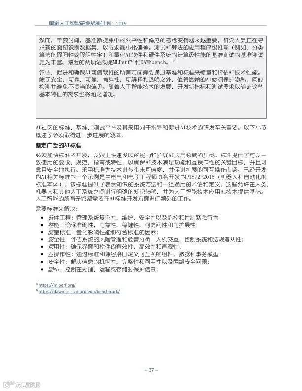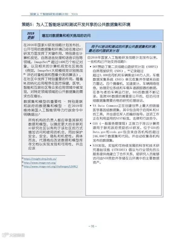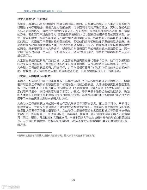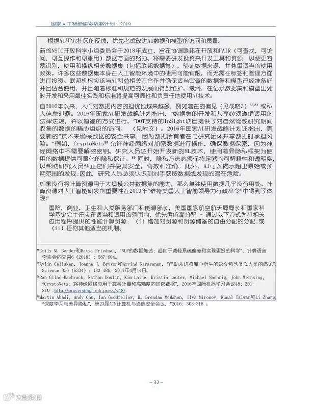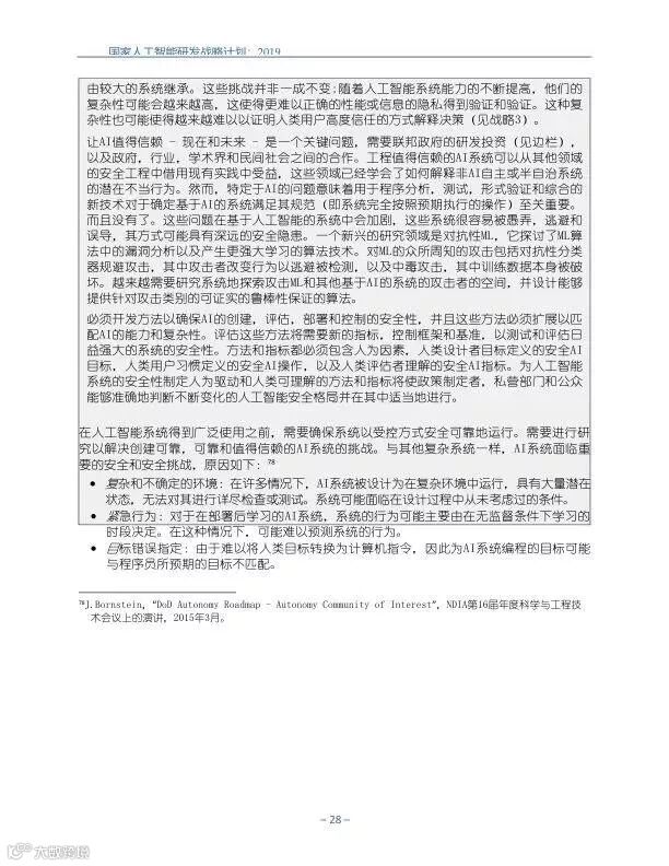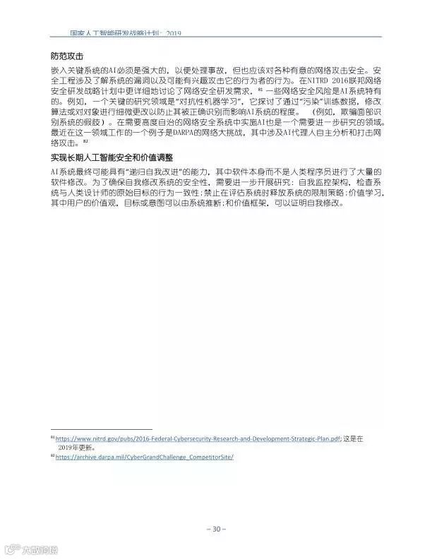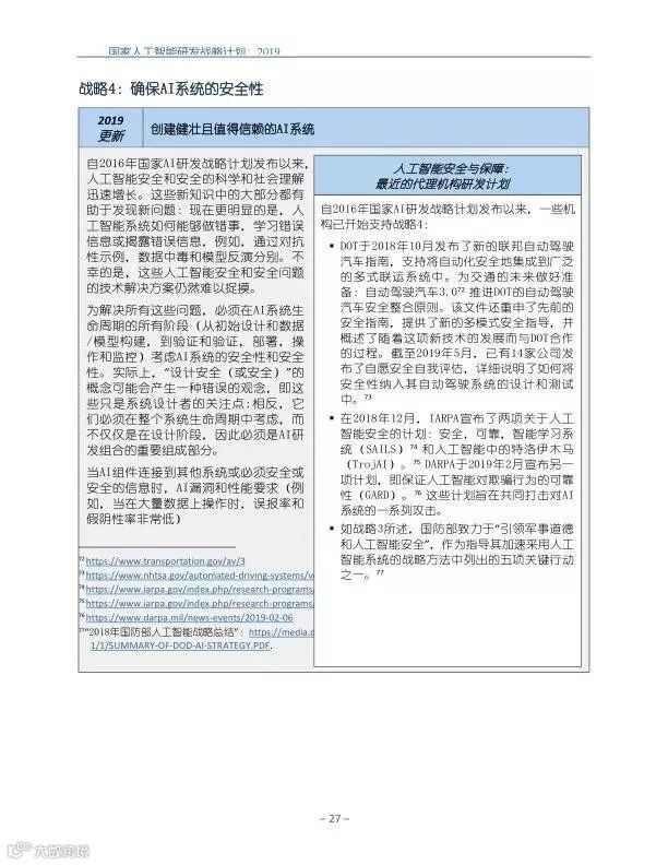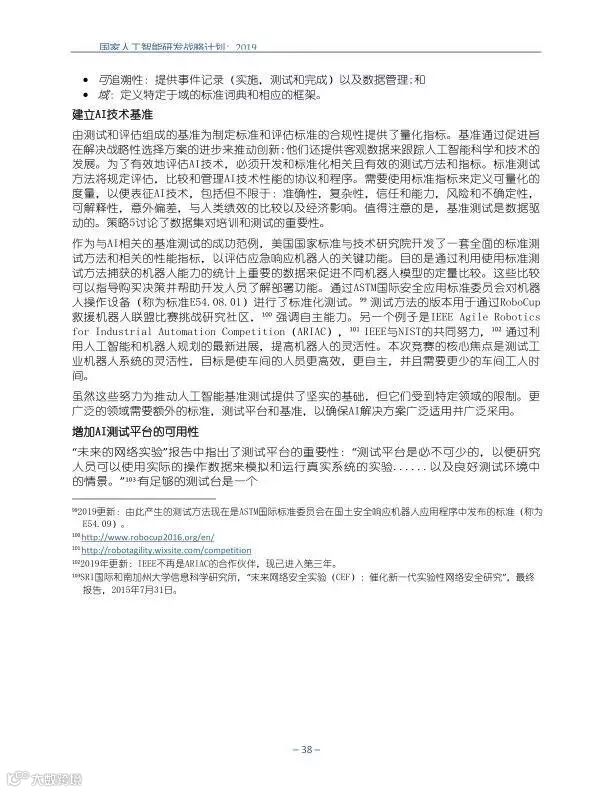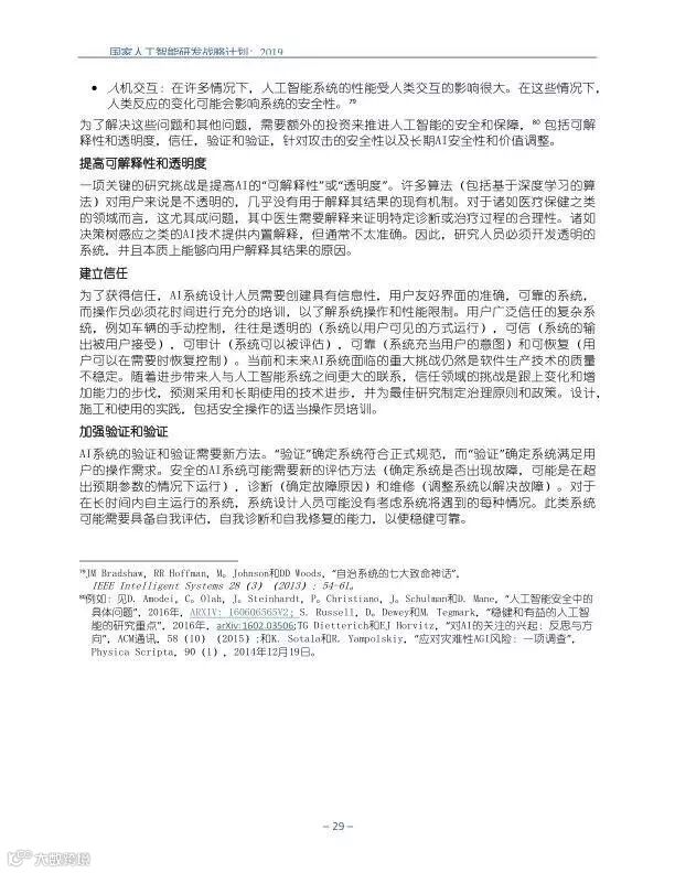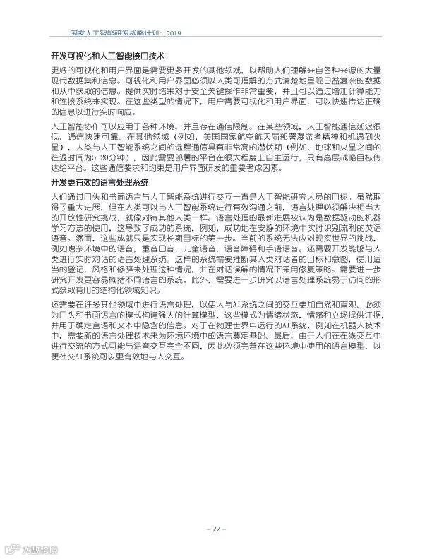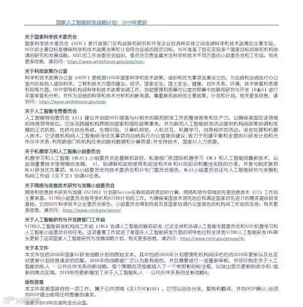 为支持美国人工智能倡议,该国家人工智能研发战略计划:2019年更新确定了联邦投资于人 工智能研发的优先领域。2019年的更新建立在2016年发布的第一个国家AI研发战略计划的基 础上,考虑了过去三年中出现的新研究,技术创新和其他考虑因素。此更新由来自联邦政府 的领先AI研究人员和研究管理人员开发,得到了更广泛的民间社会的投入,包括来自美国许 多领先的学术研究机构,非营利组织和私营部门技术公司。这些主要利益攸关方的反馈肯定 了2016年战略计划各部分的持续相关性,同时也呼吁更加重视人工智能值得信赖,与私营部 门合作以及其他必要措施。