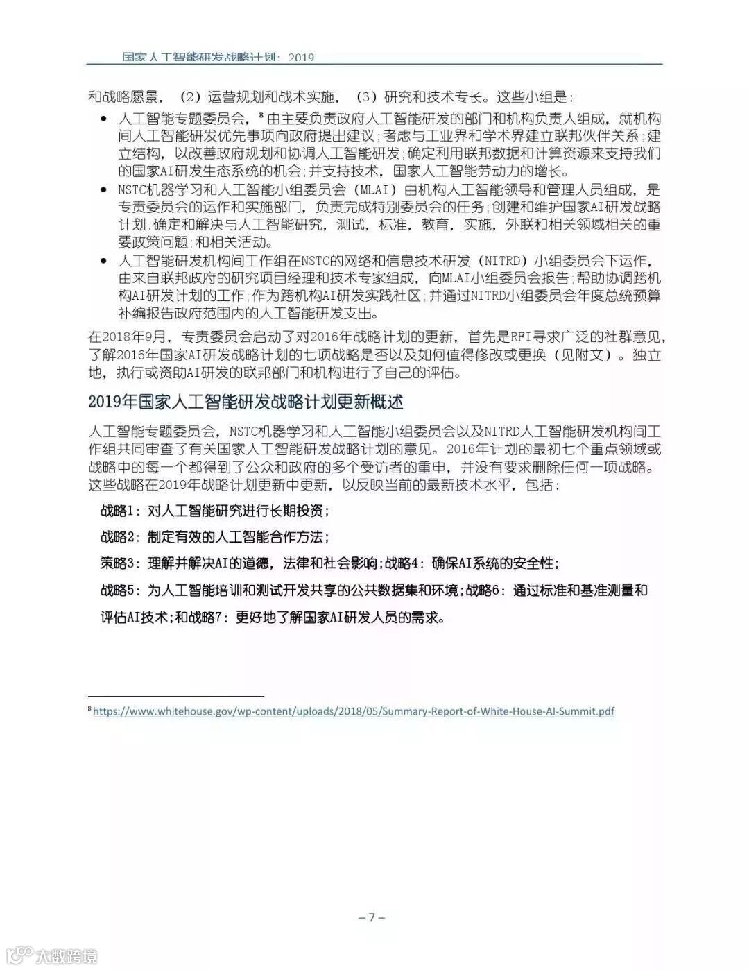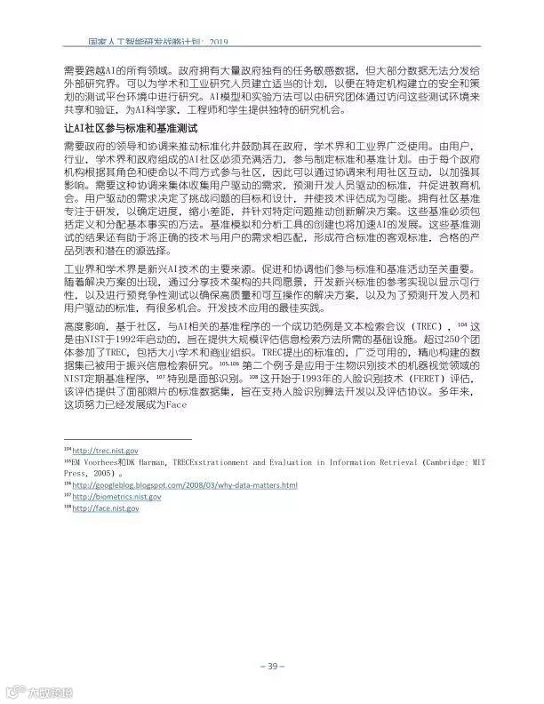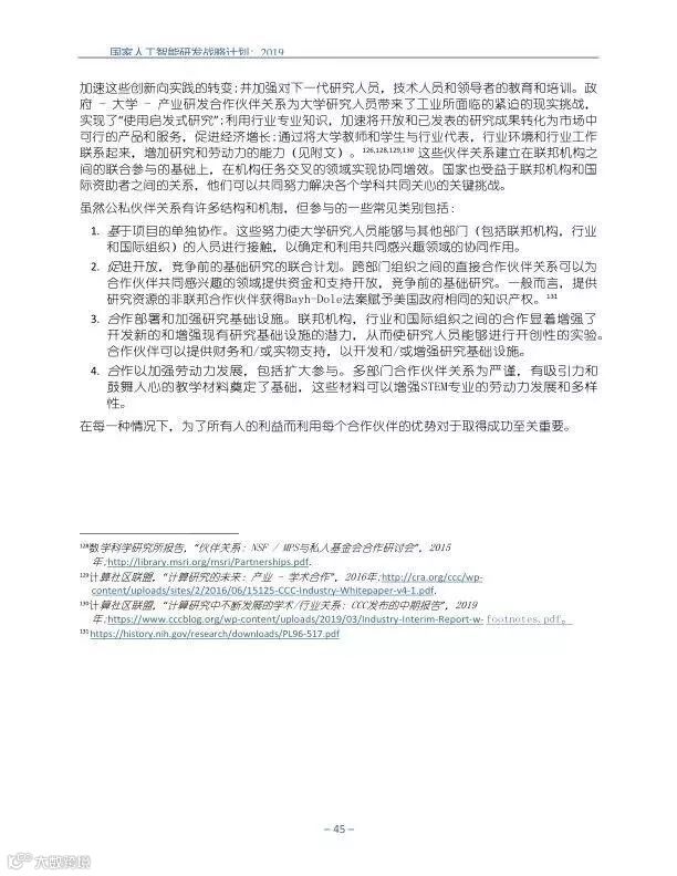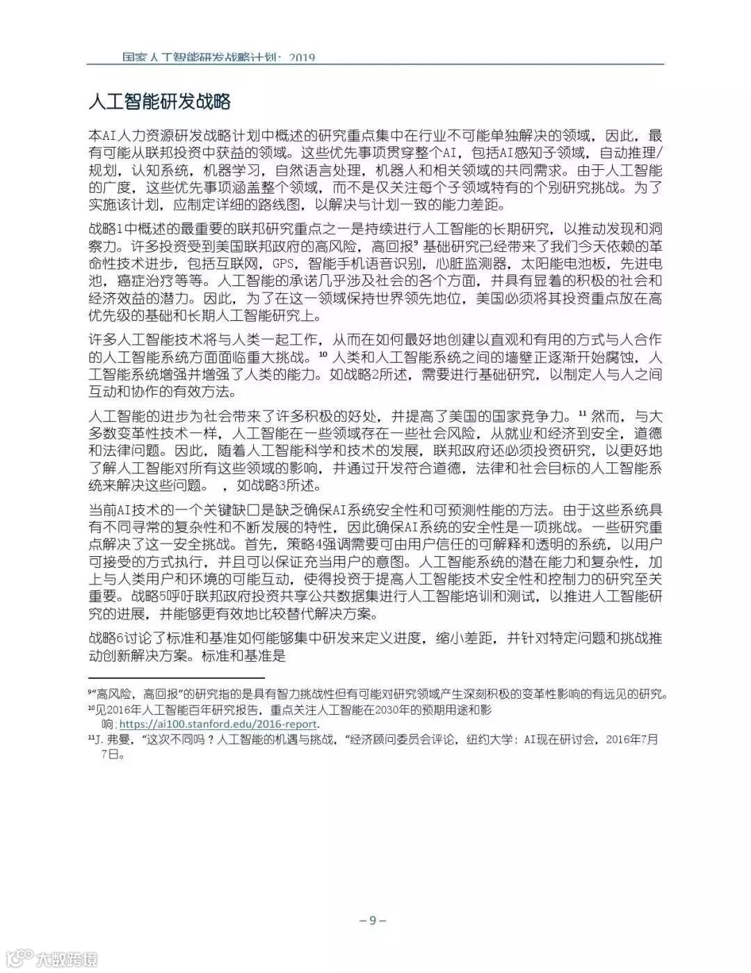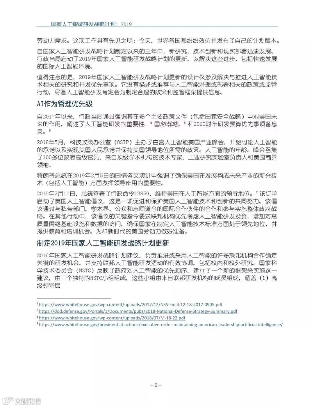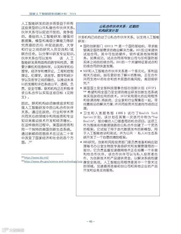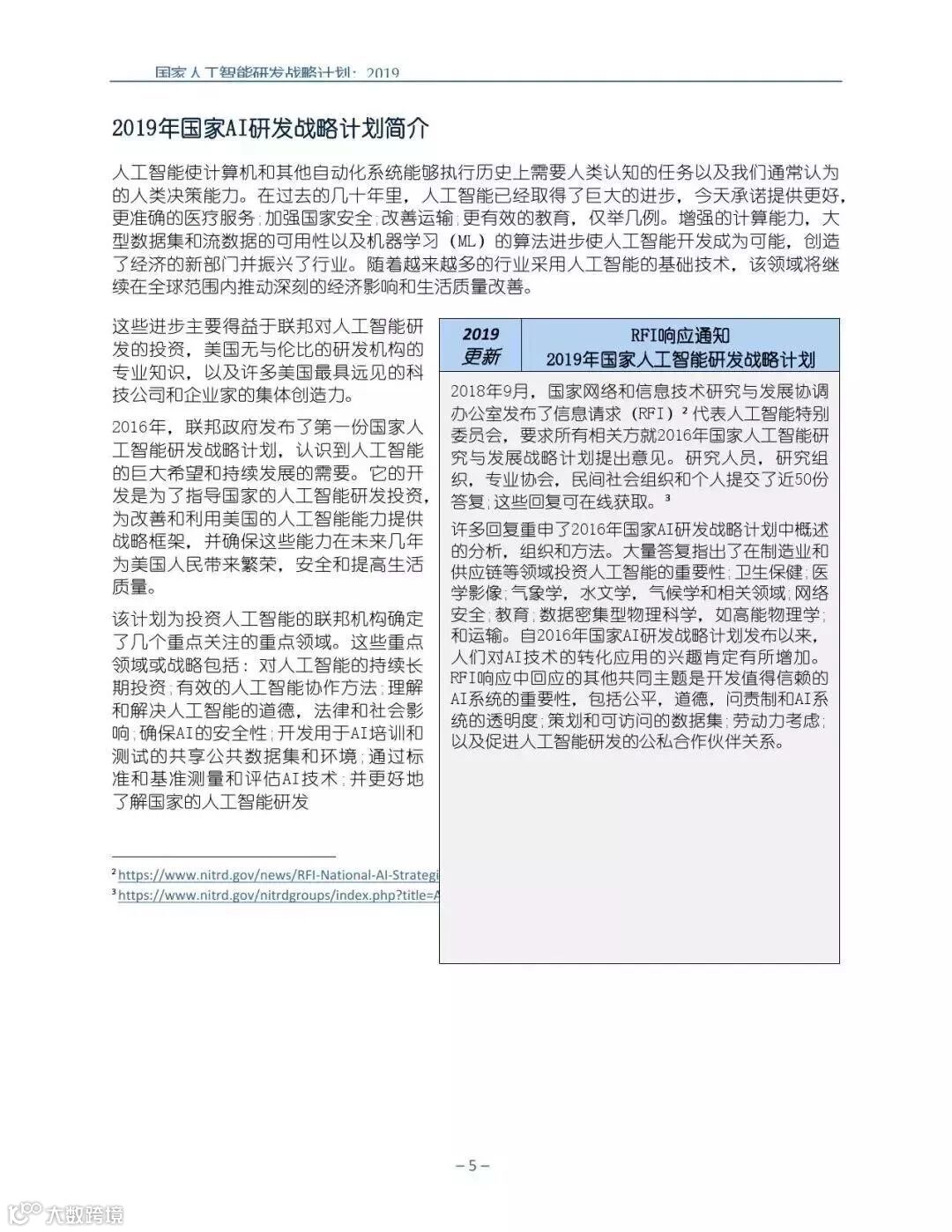 为支持美国人工智能倡议,该国家人工智能研发战略计划:2019年更新确定了联邦投资于人 工智能研发的优先领域。2019年的更新建立在2016年发布的第一个国家AI研发战略计划的基 础上,考虑了过去三年中出现的新研究,技术创新和其他考虑因素。此更新由来自联邦政府 的领先AI研究人员和研究管理人员开发,得到了更广泛的民间社会的投入,包括来自美国许 多领先的学术研究机构,非营利组织和私营部门技术公司。这些主要利益攸关方的反馈肯定 了2016年战略计划各部分的持续相关性,同时也呼吁更加重视人工智能值得信赖,与私营部 门合作以及其他必要措施。