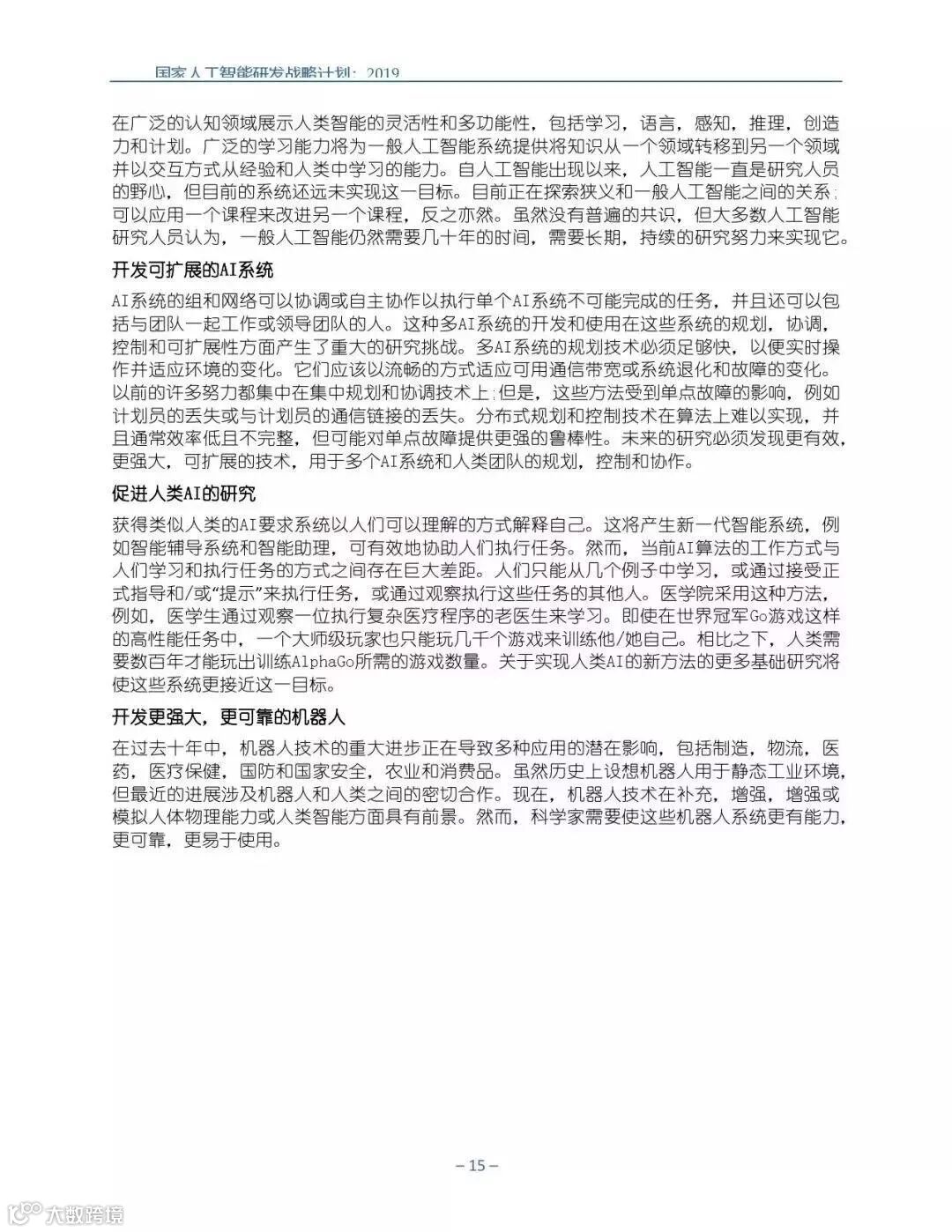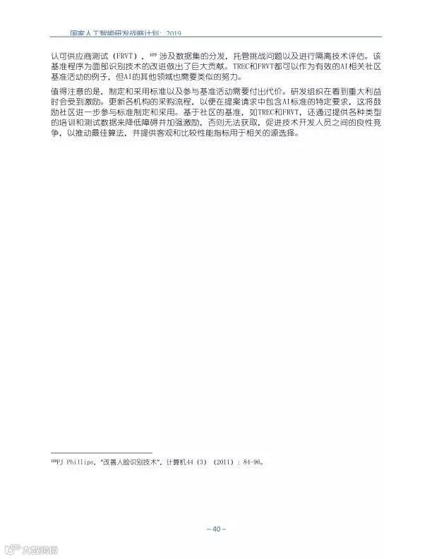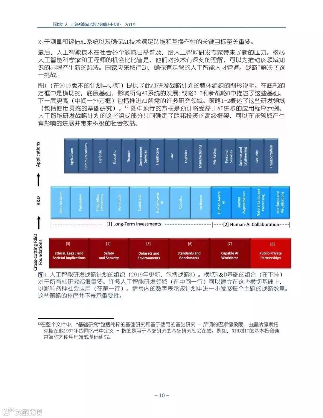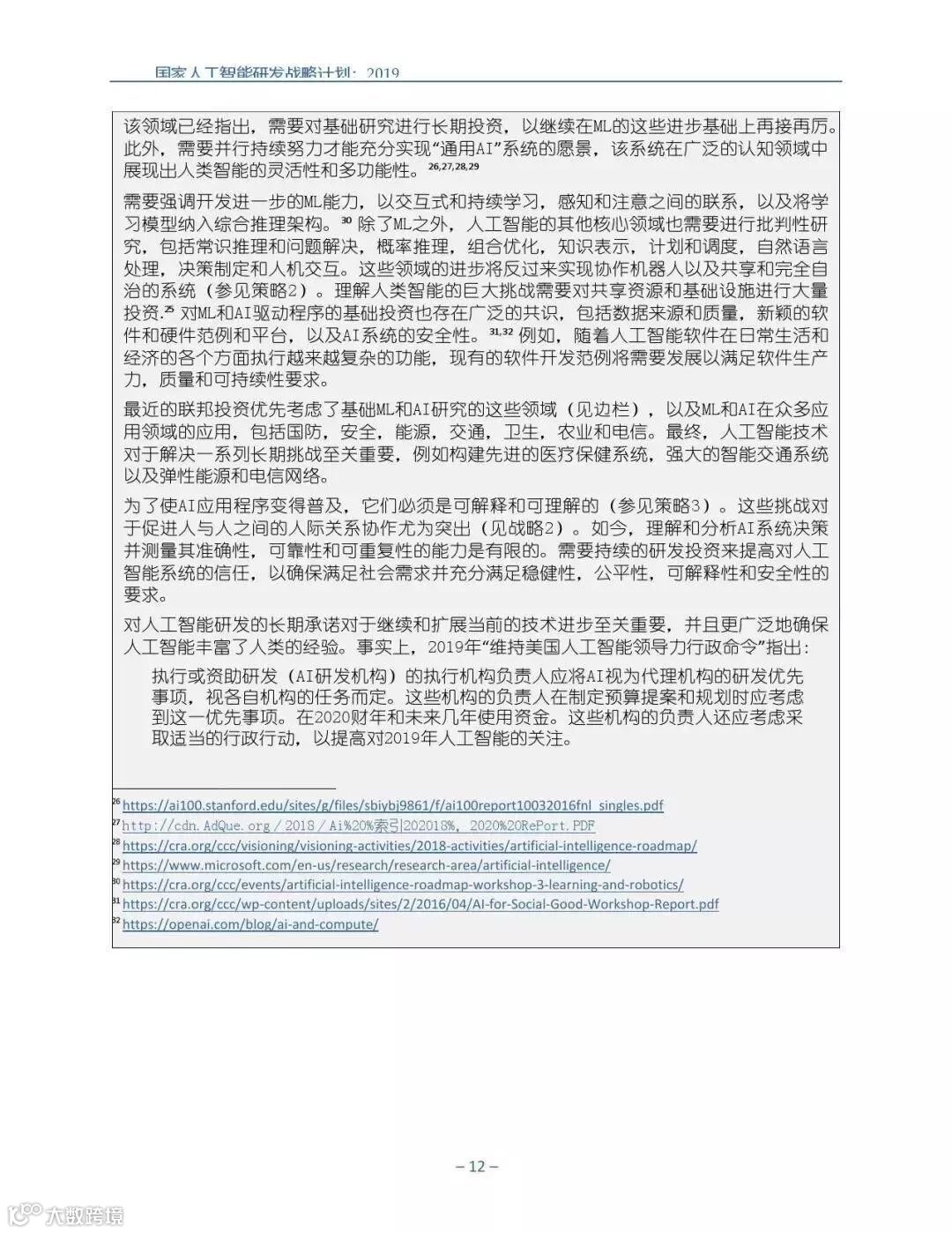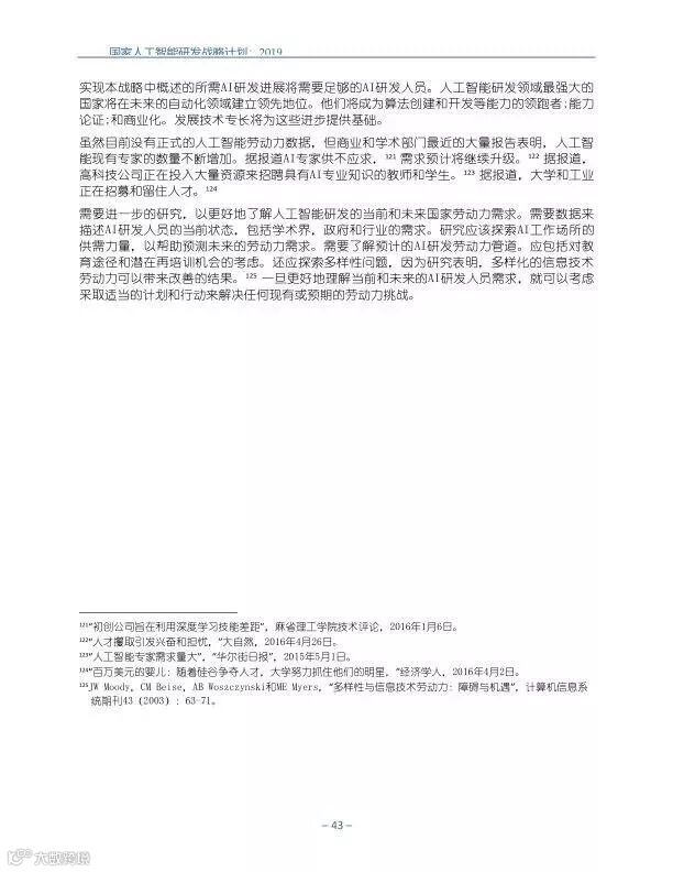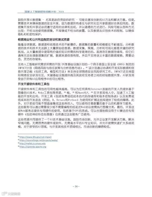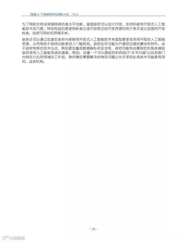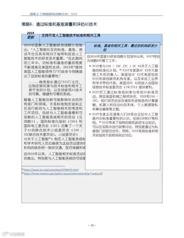 为支持美国人工智能倡议,该国家人工智能研发战略计划:2019年更新确定了联邦投资于人 工智能研发的优先领域。2019年的更新建立在2016年发布的第一个国家AI研发战略计划的基 础上,考虑了过去三年中出现的新研究,技术创新和其他考虑因素。此更新由来自联邦政府 的领先AI研究人员和研究管理人员开发,得到了更广泛的民间社会的投入,包括来自美国许 多领先的学术研究机构,非营利组织和私营部门技术公司。这些主要利益攸关方的反馈肯定 了2016年战略计划各部分的持续相关性,同时也呼吁更加重视人工智能值得信赖,与私营部 门合作以及其他必要措施。