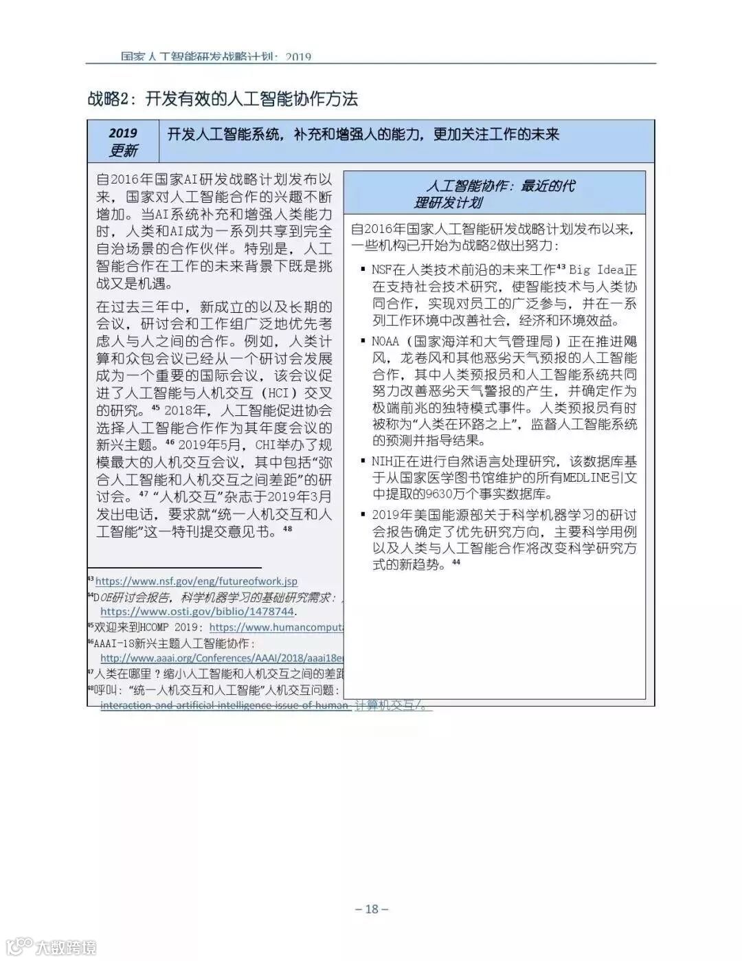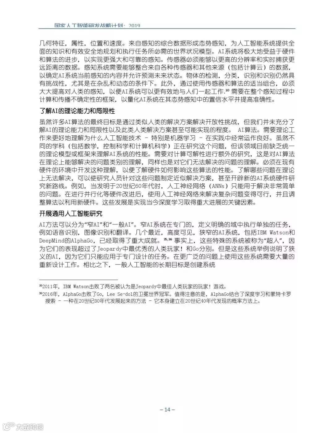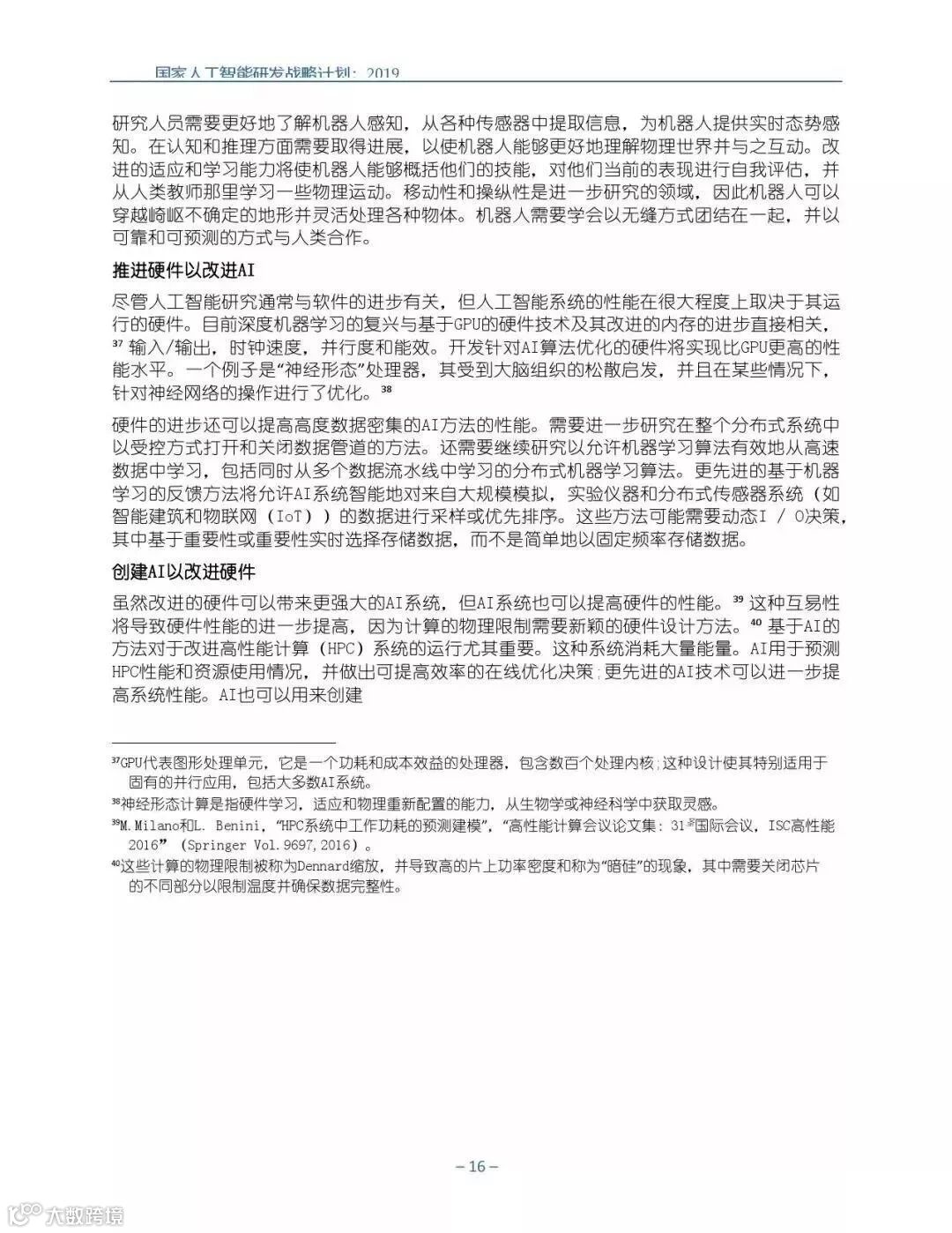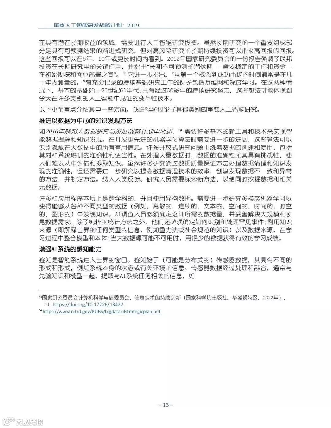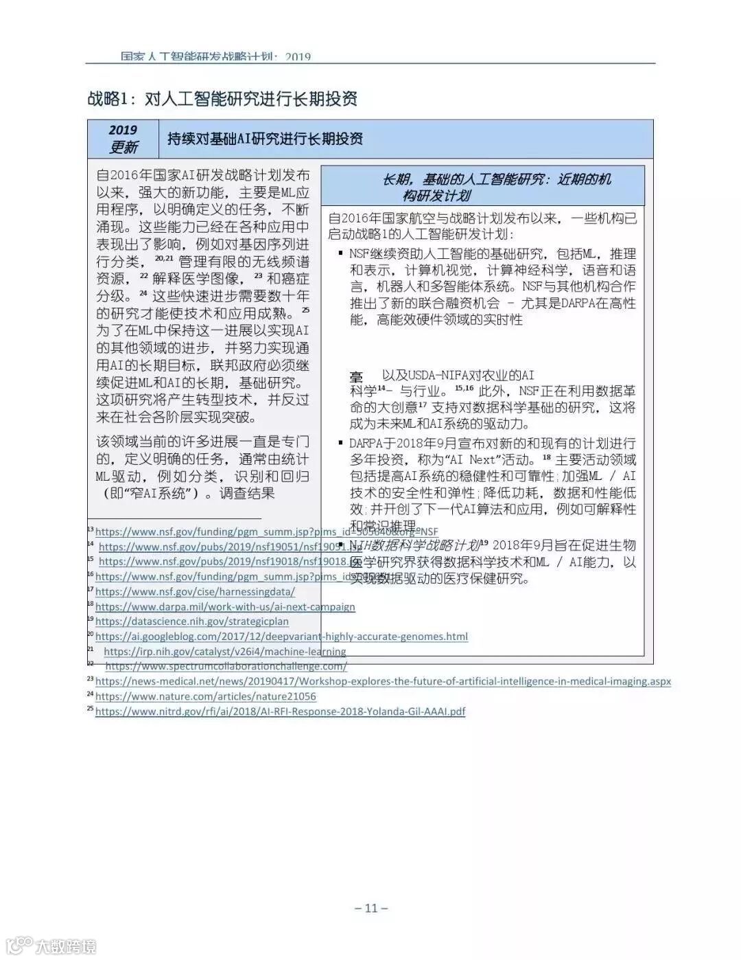 为支持美国人工智能倡议,该国家人工智能研发战略计划:2019年更新确定了联邦投资于人 工智能研发的优先领域。2019年的更新建立在2016年发布的第一个国家AI研发战略计划的基 础上,考虑了过去三年中出现的新研究,技术创新和其他考虑因素。此更新由来自联邦政府 的领先AI研究人员和研究管理人员开发,得到了更广泛的民间社会的投入,包括来自美国许 多领先的学术研究机构,非营利组织和私营部门技术公司。这些主要利益攸关方的反馈肯定 了2016年战略计划各部分的持续相关性,同时也呼吁更加重视人工智能值得信赖,与私营部 门合作以及其他必要措施。
