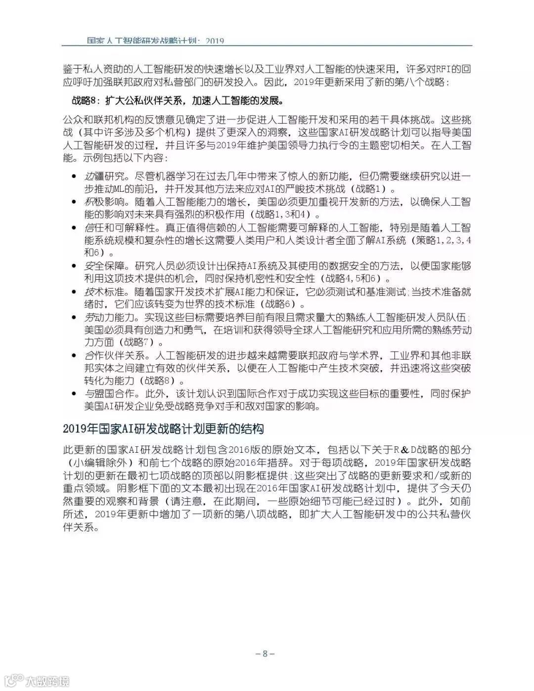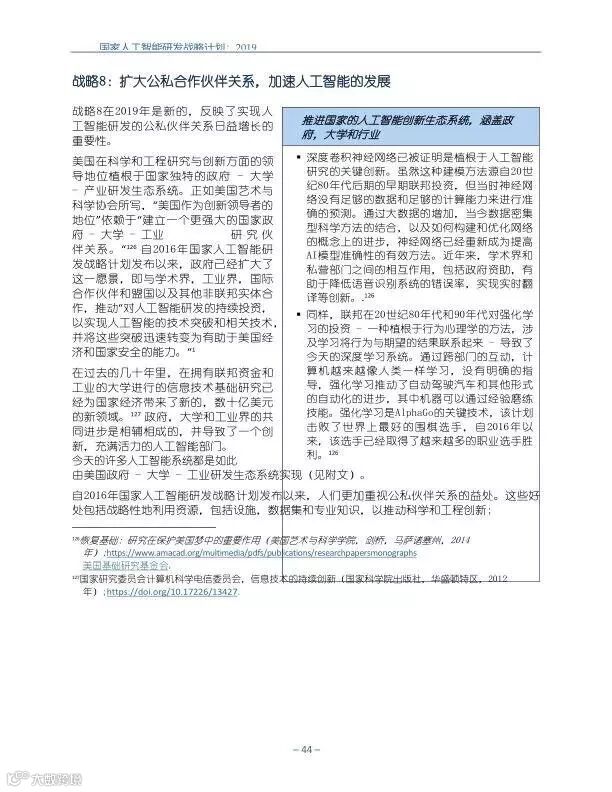 策略8:扩大公私伙伴关系,加速人工智能的发展。与学术界,行业,国际合作伙伴和其他非 联邦实体合作,促进人工智能研发持续投资和将进步转化为实际能力的机会。