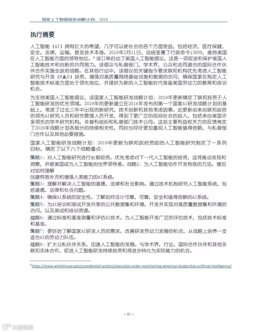 人工智能(AI)拥有巨大的希望,几乎可以使社会的各个方面受益,包括经济,医疗保健, 安全,法律,运输,甚至技术本身。2019年2月11日,总统签署了行政命令13859,维持美国 在人工智能方面的领导地位。