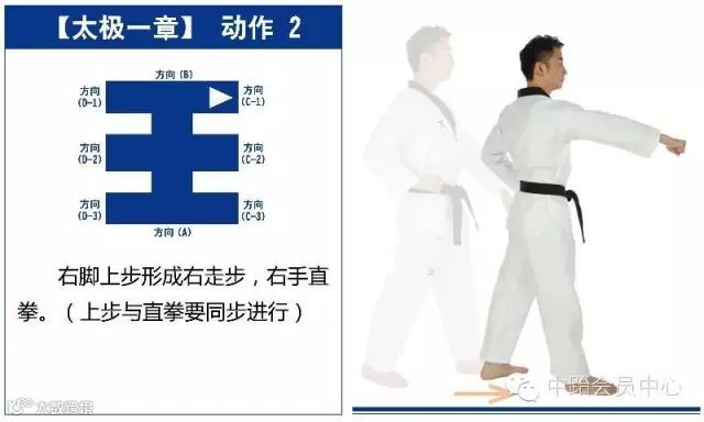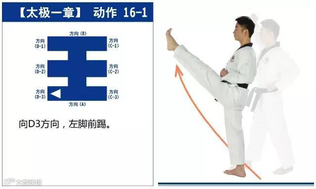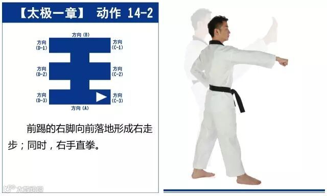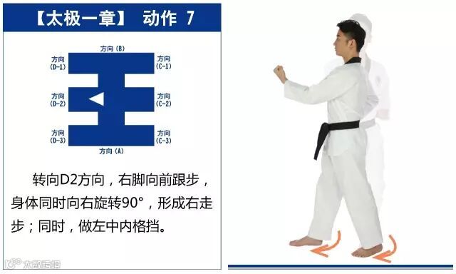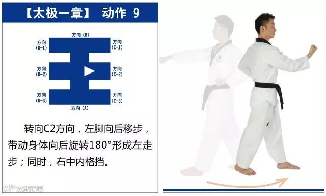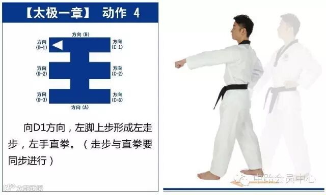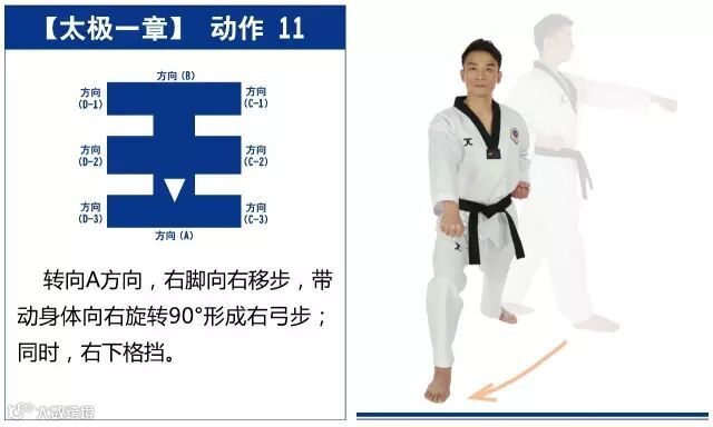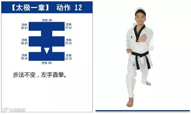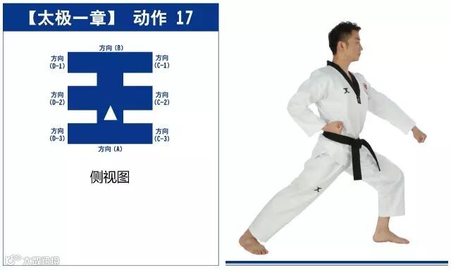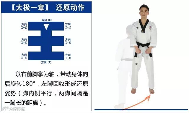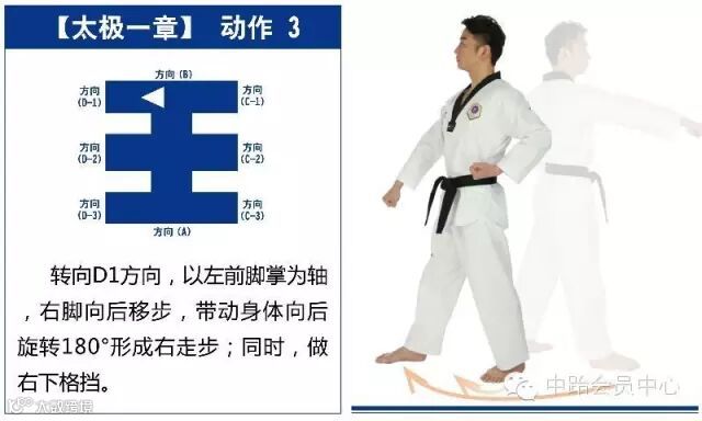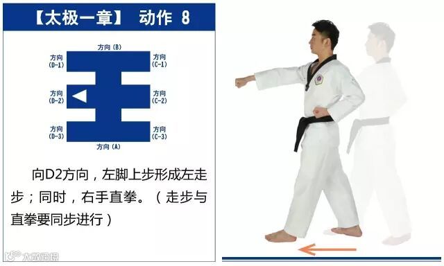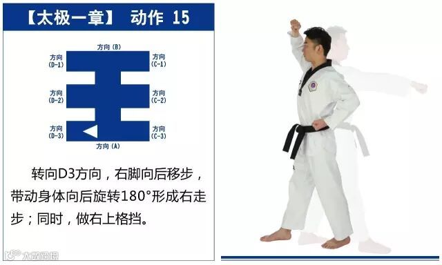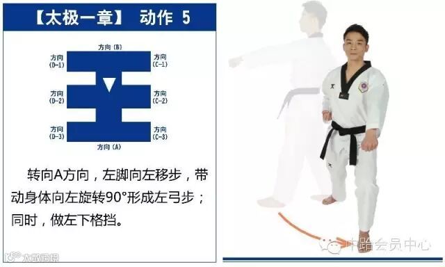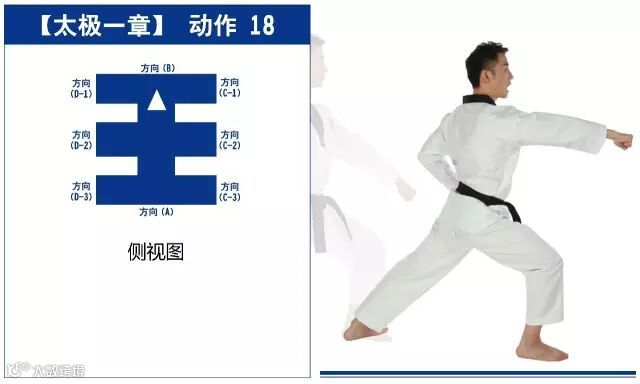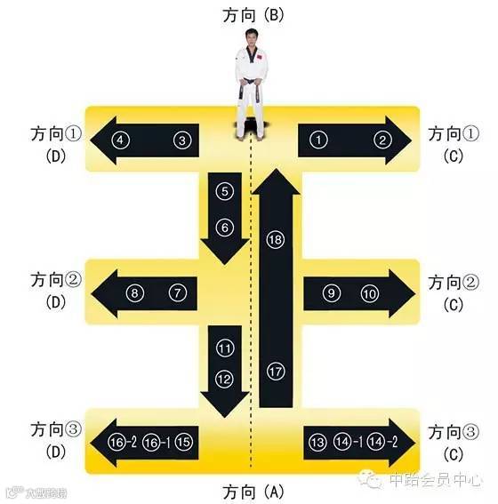 特点是以站势和简单的走步为主,动作由基础动作下格挡、中内格挡、上格挡、直拳、前踢组成,适合跆拳道8级修炼者练习。