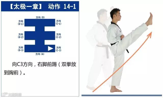 注意事项:左右移动或旋转时以前脚掌为轴,上格挡前踢与直拳要同步进行,弓步移动的路线是直线。