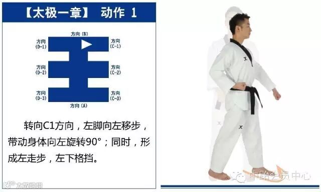 太极一章的含义是八卦中的“乾”,指天、父(阳),“乾”象征是万物的根源,意味着初始,因此是跆拳道品势当中的第一套品势。