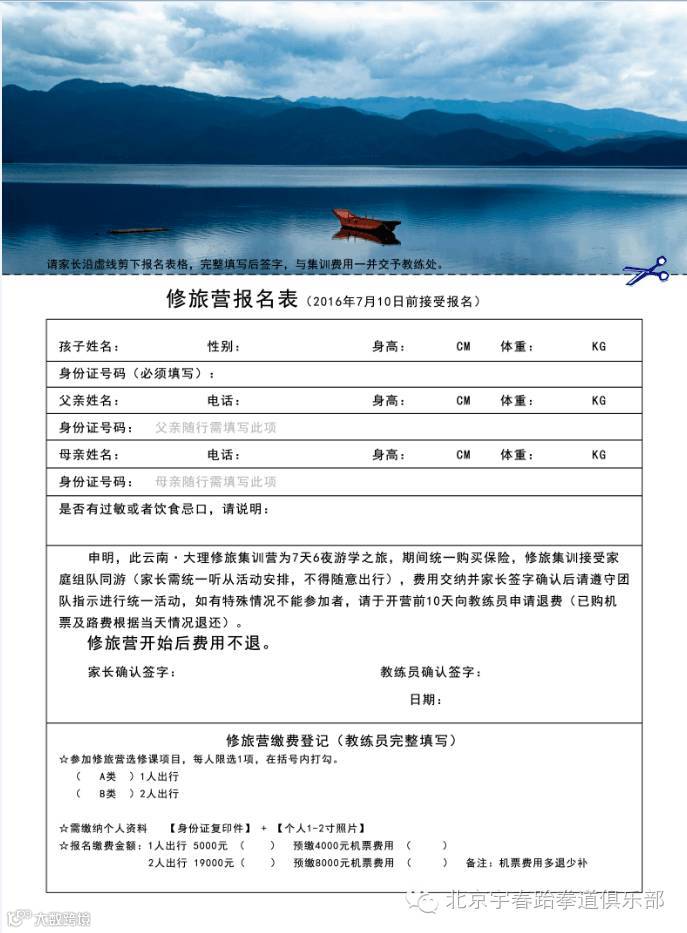 本次集训营是北京宇春跆拳道继2011年第一期(沈阳)、2012年第二期(苏州)、之后重装打造的“原生态”远行修旅训练营,参营学员将与江苏省、广西自治区、以及云南本省的跆拳道学员们一起度过为期7天的团队生活。力图以跆拳道修炼为平台提升参训学员独立自主的生活能力拓展社交平台。
