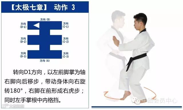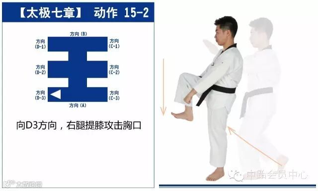 新动作包括手刀下格挡、掌根中内格挡、并步抱拳、剪刀手格挡、膝击胸口、双手交叉中位外格挡、交叉拳下格挡、背拳外击等,适合跆拳道2级修炼者练习。