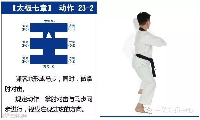 注意事项:要求虎步做得规范准确。掌根中内格挡后,背拳前击的高度是人中,手脚要同时进行,剪刀手格挡时要连续进行,要利用腰部的力量。动作21-22的内摆与掌肘对击的动作要同步进行,掌肘对击的高度是胸口。背拳外击时起始动作从肩部开始,拳心向脸部。