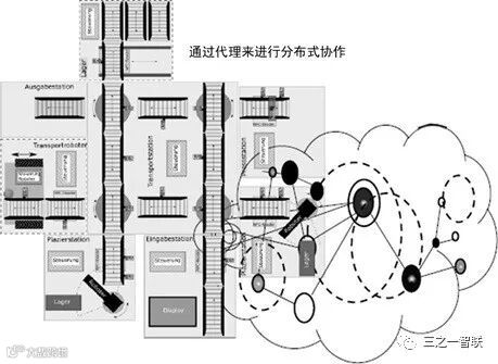 如上图5所示,产品的工艺路径由决策算法来推导,并下发给相应的作业管理系统,“智物”化资源、工具或设备之间通过各自的代理来进行相互沟通,工件或在制品在不同位置之间的传送则由AGV小车来完成。