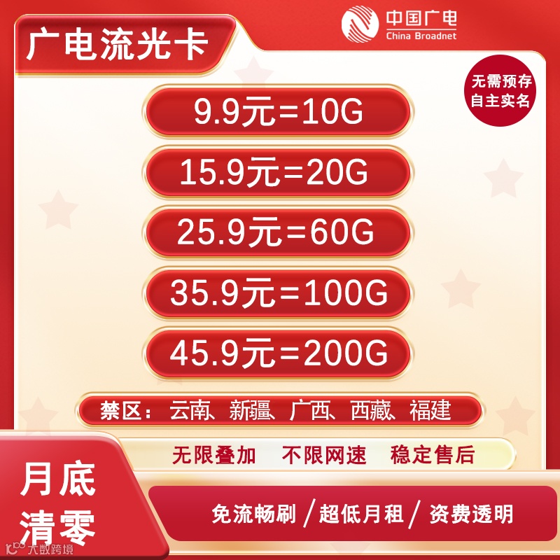 低价套餐,高速流量,稳定不断,不限速,全国通用流量,流量月底清零。